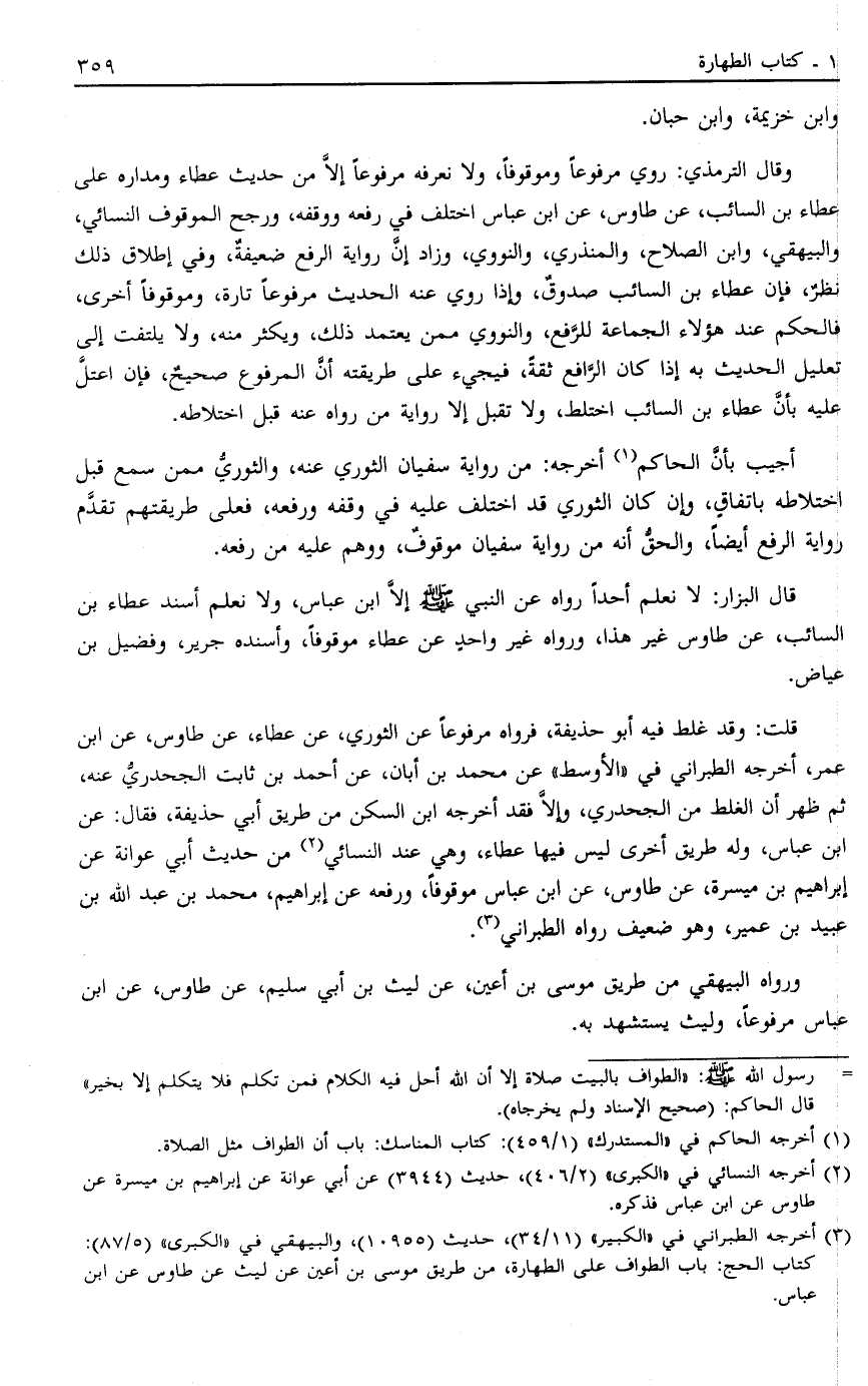 3 أخرجه الطبراني في "الكبير" "11/34"، حديث "10955"، والبيهقي في " الكبرى" "5/87": كتاب الحج: باب الطواف على الطهارة، من طريق موسى بن أعين عن ليث عن طاوس عن ابن عباس.