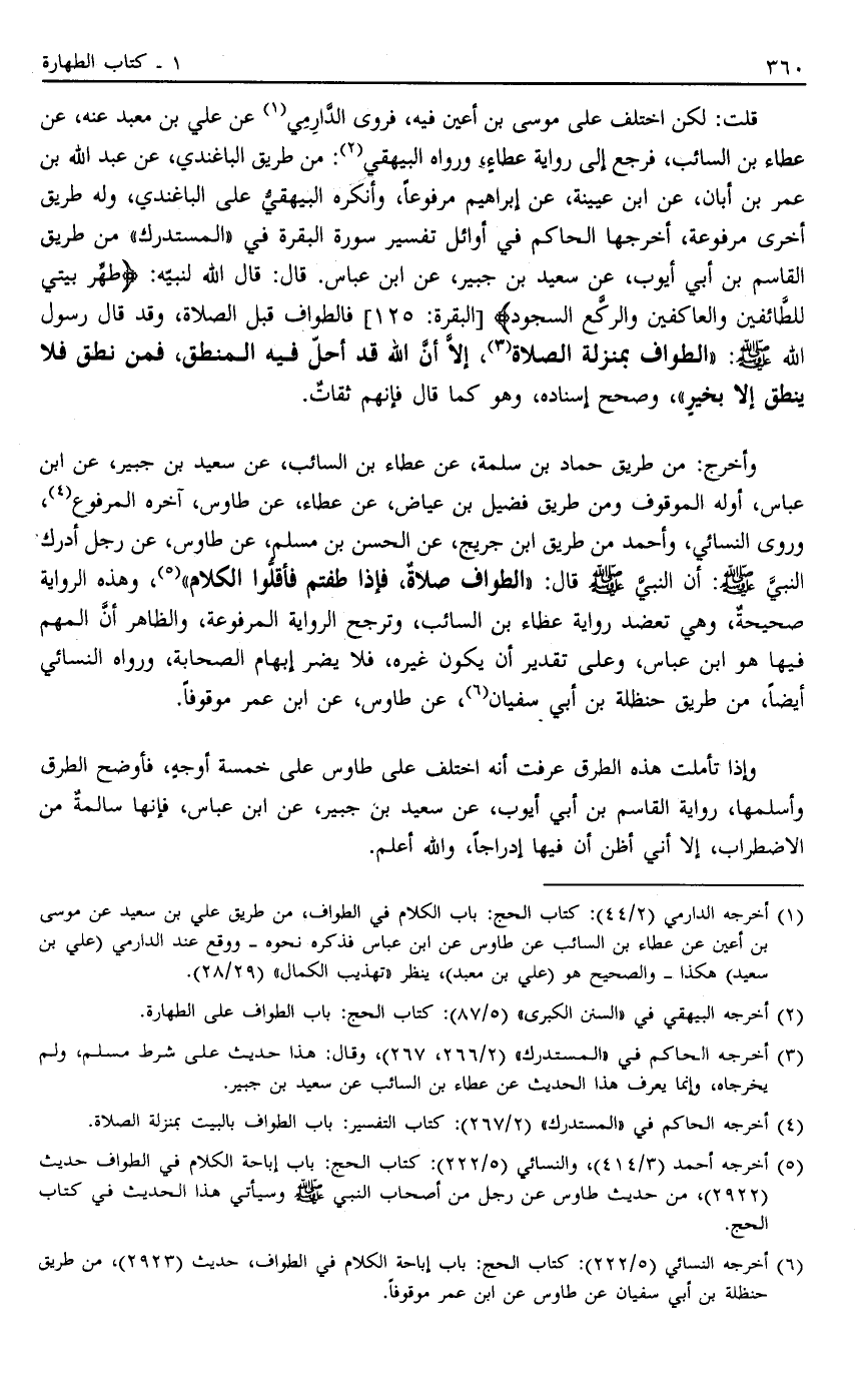1 أخرجه الدارمي "2/44": كتاب الحج: باب الكلام في الطواف، من طريق علي بن سعيد عن موسى بن أعين عن عطاء بن السائب عن طاوس عن ابن عباس فذكره نحوه- ووقع عند الدارمي "علي بن سعيد" هكذا- والصحيح هو "علي بن معبد"، ينظر "تهذيب الكمال" "29/28".