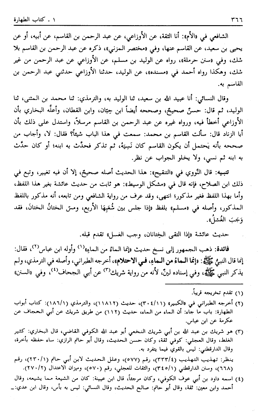 فَائِدَةٌ ذَهَبَ الْجُمْهُورُ إلَى نَسْخِ حَدِيثِ: "إنَّمَا الْمَاءُ مِنْ الْمَاءِ" 1 وَأَوَّلَهُ ابْنُ عَبَّاسٍ2 فَقَالَ إنَّمَا قَالَ النَّبِيُّ صَلَّى اللَّهُ عَلَيْهِ وَسَلَّمَ: "إنَّمَا الْمَاءُ مِنْ الْمَاءِ" فِي الِاحْتِلَامِ, أَخْرَجَهُ الطَّبَرَانِيُّ وَأَصْلُهُ فِي التِّرْمِذِيِّ وَلَمْ يذكر النبي صَلَّى اللَّهُ عَلَيْهِ وَسَلَّمَ وَفِي إسْنَادِهِ لِينٌ لِأَنَّهُ مِنْ رِوَايَةِ شَرِيكٍ3 عَنْ أَبِي الْجِحَافِ4 وَفِي السُّنَنِ