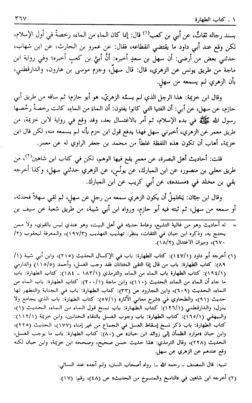 1 أخرجه أبو داود "1/147": كتاب الطهارة: باب في الإكسال الحديث "215"، وابن أبي شيبة "1/89": كتاب الطهارة: باب من قال: "إذا التقى الختانان فقد وجب الغسل"، وأحمد "5/115" والدارمي "1/194": كتاب الطهارة باب الماء من الماء، والترمذي "1/183- 184": كتاب الطهارة: باب ما جاء أن الماء من الماء، الحديث "110"، وابن ماجة "1/200": كتاب الطهارة: باب الماء من الماء، الحديث "609"، وابن الجارود ص "33": كتاب الطهارة: باب في الجنابة والتطهر لها حديث "91"، والطحاوي في "شرح معاني الآثار" "1/57": كتاب الطهارة: باب الذي يجامع ولا ينزل، والدارقطني "1/126": كتاب الطهارة: باب نسخ قول الماء من الماء، الحديث "1"، والبيهقي "1/165": كتاب الطهارة: باب وجوب الغسل بالتقاء الختانين، وابن خزيمة "1/112": كتاب الطهارة: باب ذكر نسخ إسقاط الغسل في الجماع من غير إمناء "177"، الحديث "225"، وابن حبان "موارد الظمآن إلى زوائد ابن حبان" ص "80": كتاب الطهارة: باب ما يوجب الغسل، الحديث "228"، وقال الترمذي: هذا حديث حسن صحيح، وصححه ابن خزيمة، وابن حبان لكنه وقع عندهم عن الزهري عن سهل.