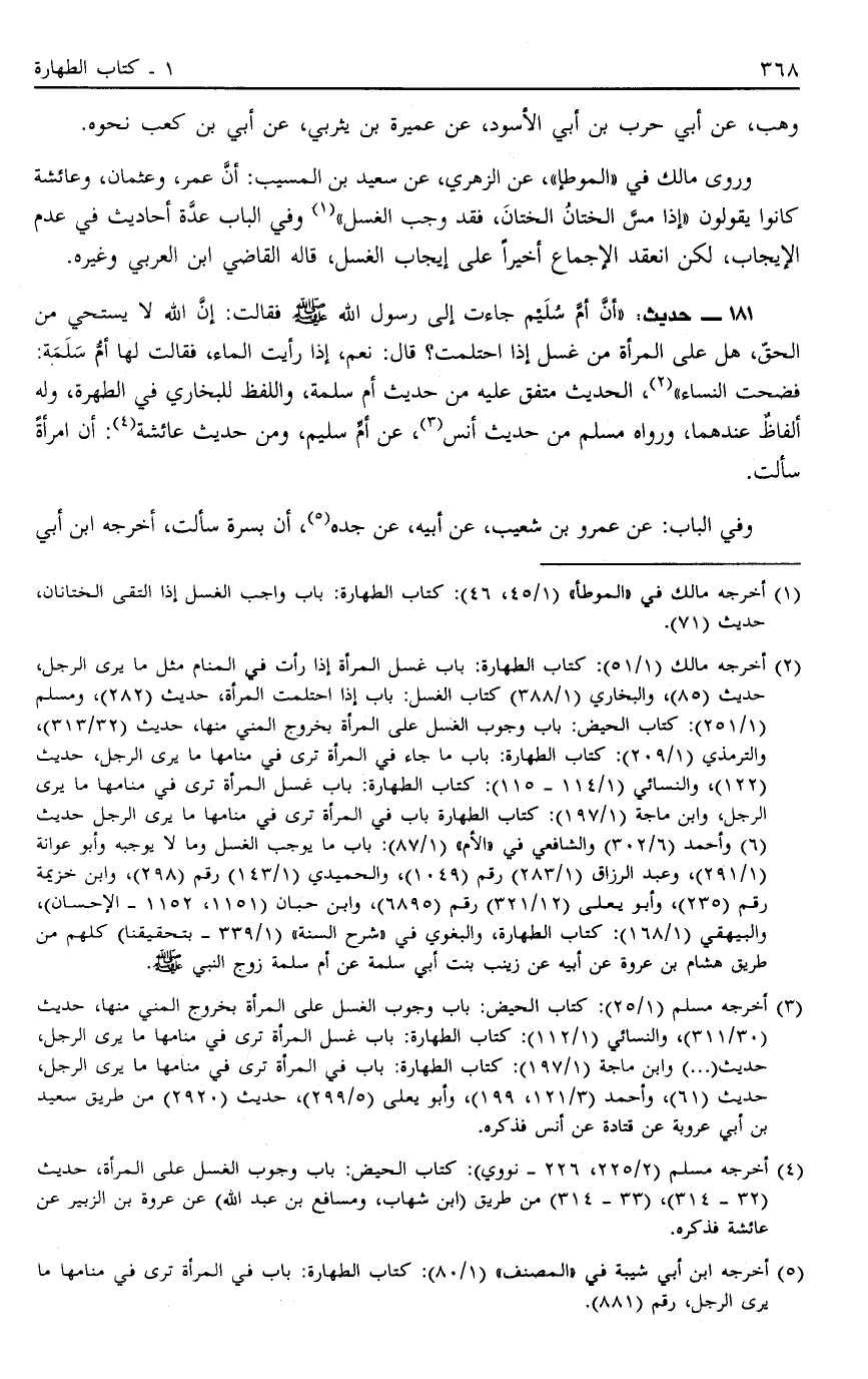 4 أخرجه مسلم "2/225، 226- نووي": كتاب الحيض: باب وجوب الغسل على المرأة، حديث "32- 314"، "33- 314" من طريق "ابن شهاب، ومسافع بن عبد الله" عن عروة بن الزبير عن عائشة فذكره.