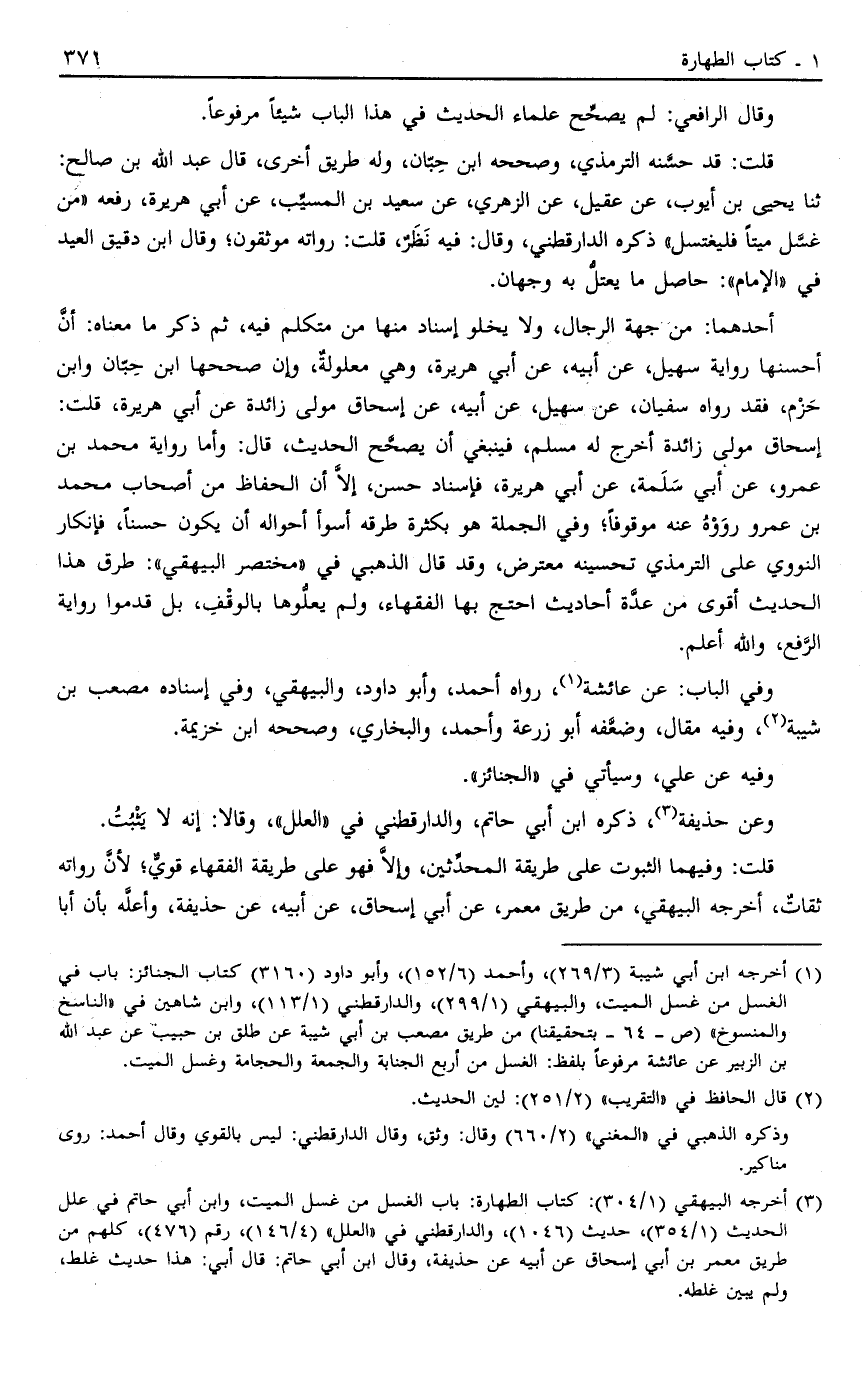 قُلْت قَدْ حَسَّنَهُ التِّرْمِذِيُّ وَصَحَّحَهُ ابْنُ حبان وله طريق أُخْرَى قَالَ عَبْدُ اللَّهِ بْنُ صَالِحٍ ثَنَا يَحْيَى بْنُ أَيُّوبَ عَنْ عُقَيْلٍ عَنْ الزُّهْرِيِّ عَنْ سَعِيدِ بْنِ الْمُسَيِّبِ عَنْ أَبِي هُرَيْرَةَ رَفَعَهُ: "مَنْ غَسَّلَ مَيِّتًا فَلْيَغْتَسِلْ" ذَكَرَهُ الدَّارَقُطْنِيُّ وَقَالَ فِيهِ نَظَرٌ قُلْت رُوَاتُهُ مُوَثَّقُونَ وَقَالَ ابْنُ دقيق العيد في الإمام حَاصِلُ مَا يَعْتَلُّ بِهِ وَجْهَانِ
