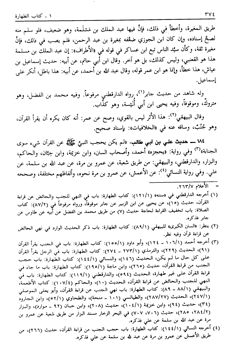 4 أخرجه النسائي "1/144": كتاب الطهارة: باب حجب الجنب من قراءة القرآن، حديث "266"، من طريق الأعمش عن عمرو بن مرة عن عبد الله بن سلمة عن علي فذكره.