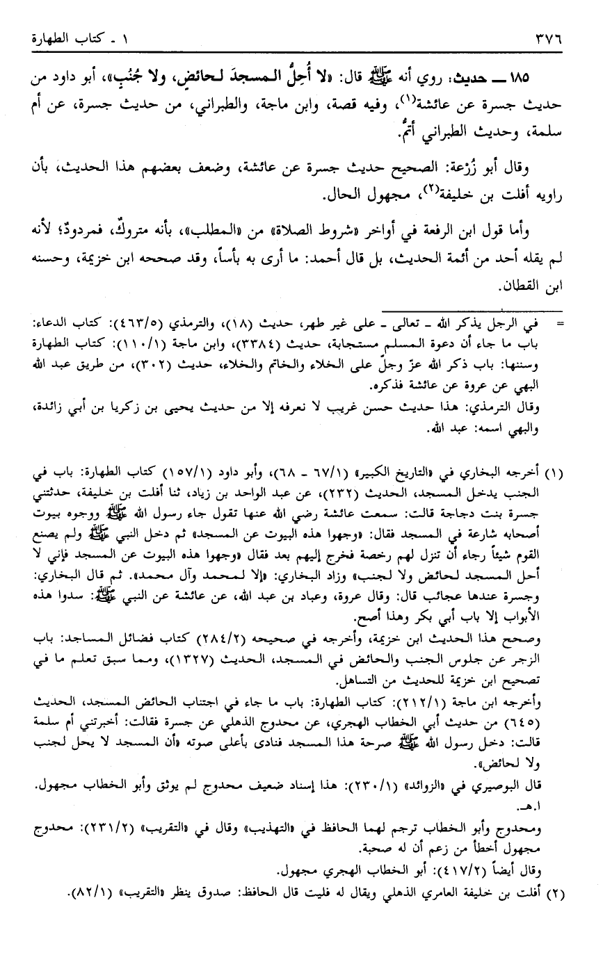 185 - حَدِيثُ رُوِيَ أَنَّهُ صَلَّى اللَّهُ عَلَيْهِ وَسَلَّمَ قَالَ: "لَا أُحِلُّ الْمَسْجِدَ لِحَائِضٍ وَلَا جُنُبٍ" أَبُو دَاوُد مِنْ حَدِيثِ جَسْرَةَ عَنْ عَائِشَةَ1 وَفِيهِ قِصَّةٌ وَابْنُ مَاجَهْ وَالطَّبَرَانِيُّ مِنْ حَدِيثِ جَسْرَةَ عَنْ أُمِّ سَلَمَةَ وَحَدِيثُ الطَّبَرَانِيُّ أَتَمُّ