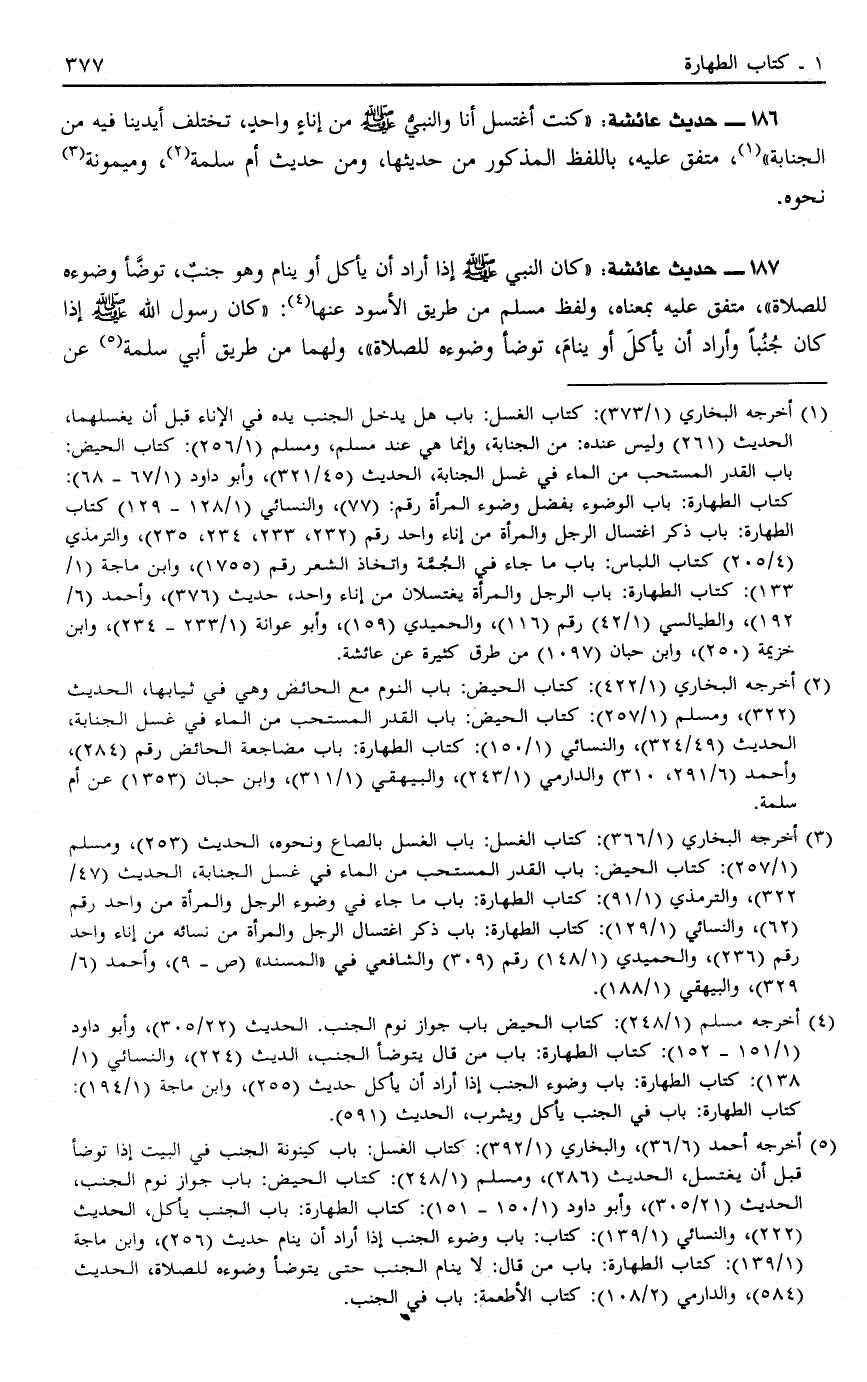 187 - حَدِيثُ عَائِشَةَ: كَانَ النَّبِيُّ صَلَّى اللَّهُ عَلَيْهِ وَسَلَّمَ إذَا أَرَادَ أَنْ يَأْكُلَ أَوْ يَنَامَ وَهُوَ جُنُبٌ تَوَضَّأَ وُضُوءَهُ لِلصَّلَاةِ مُتَّفَقٌ عَلَيْهِ بِمَعْنَاهُ وَلَفْظُ مُسْلِمٍ مِنْ طَرِيقِ الْأَسْوَدِ عَنْهَا4 كَانَ رَسُولُ اللَّهِ صَلَّى اللَّهُ عَلَيْهِ وَسَلَّمَ إذَا كَانَ جُنُبًا وَأَرَادَ أَنْ يَأْكُلَ أَوْ يَنَامَ تَوَضَّأَ وُضُوءَهُ لِلصَّلَاةِ وَلَهُمَا مِنْ طَرِيقِ أَبِي سَلَمَةَ5 عَنْ