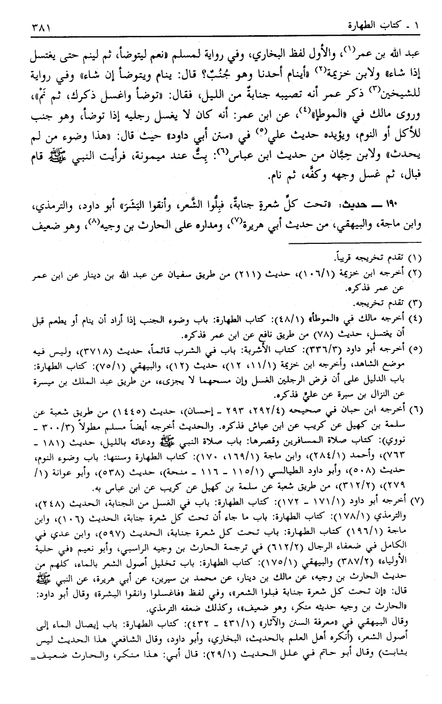 190 - حَدِيثُ: "تَحْتَ كُلِّ شَعْرَةٍ جَنَابَةٌ فَبُلُّوا الشَّعْرَ وَأَنْقُوا البشر" أَبُو دَاوُد وَالتِّرْمِذِيُّ وَابْنُ مَاجَهْ وَالْبَيْهَقِيُّ مِنْ حَدِيثِ أَبِي هُرَيْرَةَ7 وَمَدَارُهُ عَلَى الحارث بن وجبة8 وَهُوَ ضَعِيفٌ