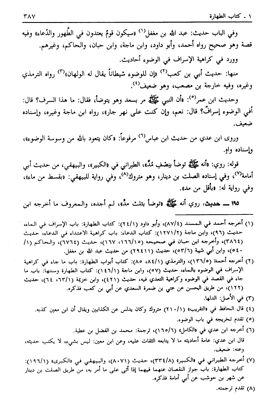 195 - حَدِيثُ: رَوَى أَنَّهُ صَلَّى اللَّهُ عَلَيْهِ وَسَلَّمَ تَوَضَّأَ بِثُلُثِ مُدٍّ لَمْ أَجِدْهُ وَالْمَعْرُوفُ مَا أَخْرَجَهُ ابْنُ