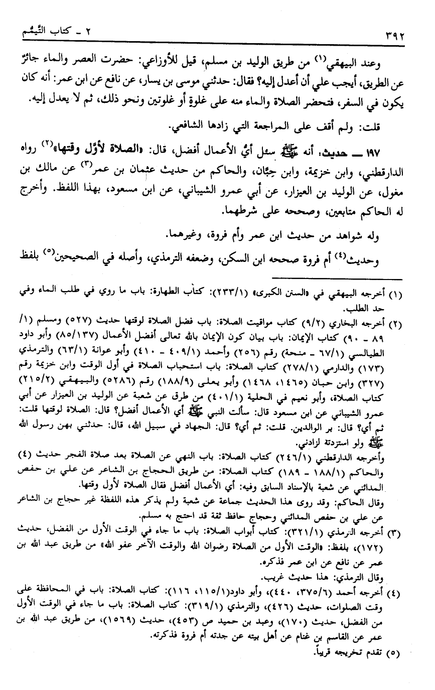 197 - حَدِيثُ أَنَّهُ صَلَّى اللَّهُ عَلَيْهِ وَسَلَّمَ سُئِلَ أَيُّ الْأَعْمَالِ أَفْضَلُ؟ قَالَ: "الصَّلَاةُ لِأَوَّلِ وَقْتِهَا" 2 رَوَاهُ الدَّارَقُطْنِيُّ وَابْنُ خُزَيْمَةَ وَابْنُ حِبَّانَ وَالْحَاكِمُ مِنْ حَدِيثِ عُثْمَانَ بْنِ عُمَرَ3 عَنْ مَالِكِ بْنِ مِغْوَلٍ عَنْ الْوَلِيدِ بْنِ الْعَيْزَارِ عَنْ أَبِي عَمْرٍو الشَّيْبَانِيِّ عَنْ ابْنِ مَسْعُودٍ بِهَذَا اللَّفْظِ وَأَخْرَجَ لَهُ الْحَاكِمُ مُتَابِعَيْنِ وَصَحَّحَهُ عَلَى شَرْطِهِمَا