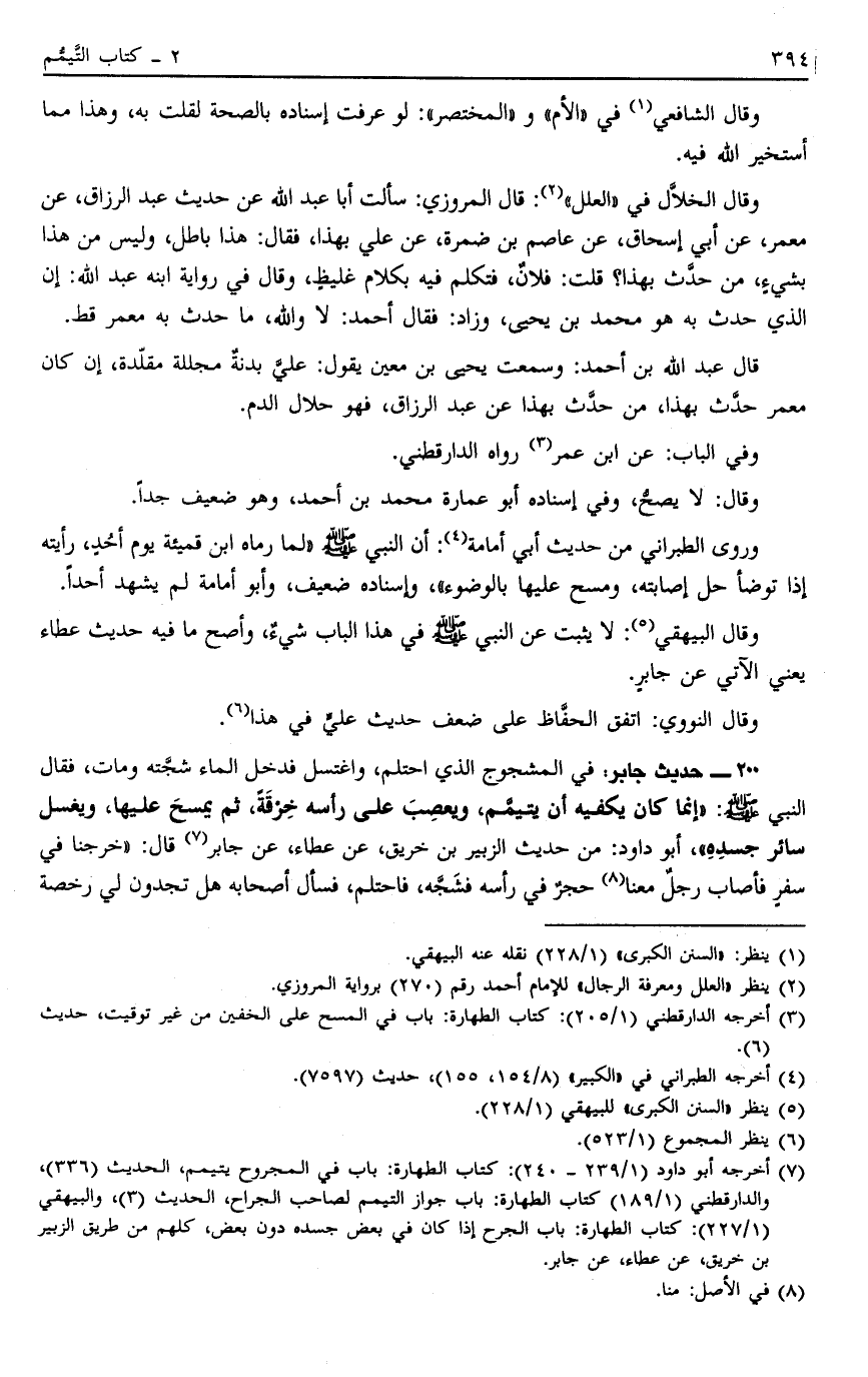 200 - حَدِيثُ جَابِرٍ فِي الْمَشْجُوجِ الَّذِي احْتَلَمَ وَاغْتَسَلَ فَدَخَلَ الْمَاءُ شَجَّتَهُ وَمَاتَ فَقَالَ النَّبِيُّ صَلَّى اللَّهُ عَلَيْهِ وَسَلَّمَ: "إنَّمَا كَانَ يَكْفِيهِ أَنْ يَتَيَمَّمَ وَيَعْصِبَ عَلَى رَأْسِهِ خِرْقَةً ثُمَّ يَمْسَحَ عَلَيْهَا وَيَغْسِلَ سَائِرَ جَسَدِهِ" أَبُو دَاوُد مِنْ حَدِيثِ الزُّبَيْرِ بْنِ خُرَيْقٍ عَنْ عَطَاءٍ عَنْ جَابِرٍ7 قَالَ: خَرَجْنَا في سفر فأصاب رجل مَعَنَا8 حَجَرٌ فِي رَأْسِهِ فَشَجَّهُ فَاحْتَلَمَ فَسَأَلَ أَصْحَابَهُ هَلْ تَجِدُونَ لِي رُخْصَةً؟