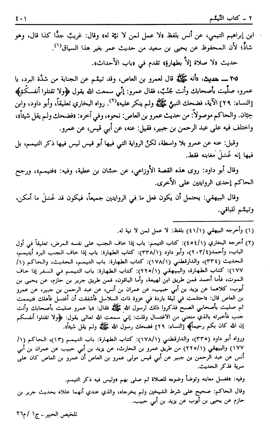 205 - حَدِيثُ أَنَّهُ صَلَّى اللَّهُ عَلَيْهِ وَسَلَّمَ قَالَ لِعَمْرِو بْنِ الْعَاصِ: وَقَدْ تَيَمَّمَ عَنْ الْجَنَابَةِ مِنْ شِدَّةِ الْبَرْدِ: "يَا عَمْرُو صَلَّيْتَ بِأَصْحَابِكَ وَأَنْتَ جُنُبٌ؟ " فَقَالَ عَمْرٌو: إنِّي سَمِعْتُ اللَّهَ يَقُولُ: {وَلَا تَقْتُلُوا أَنْفُسَكُمْ} الْآيَةَ فَضَحِكَ النَّبِيُّ صَلَّى اللَّهُ عَلَيْهِ وَسَلَّمَ وَلَمْ يُنْكِرْ عَلَيْهِ2 رَوَاهُ الْبُخَارِيُّ تَعْلِيقًا وَأَبُو دَاوُد وَابْنُ حِبَّانَ وَالْحَاكِمُ مَوْصُولًا مِنْ حَدِيثِ عَمْرِو بْنِ الْعَاصِ نَحْوُهُ وَفِي آخِرِهِ فَضَحِكَ وَلَمْ يَقُلْ شَيْئًا وَاخْتُلِفَ فِيهِ عَلَى عَبْدِ الرَّحْمَنِ بْنِ جُبَيْرٍ فَقِيلَ عَنْهُ عَنْ أَبِي قَيْسٍ عَنْ عَمْرٍو