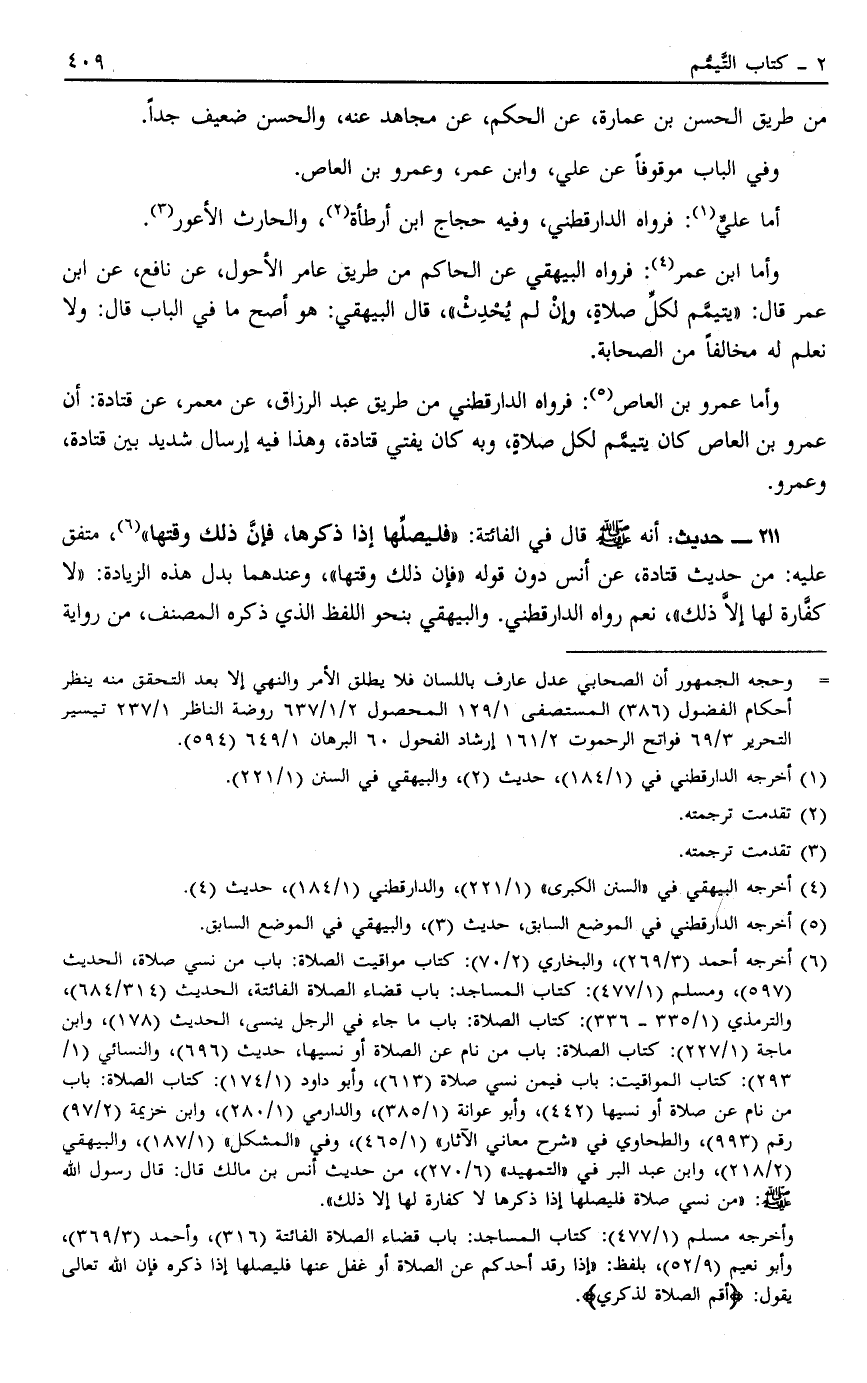 وَأَمَّا عَمْرُو بْنُ الْعَاصِ5 فَرَوَاهُ الدَّارَقُطْنِيُّ مِنْ طَرِيقِ عَبْدِ الرَّزَّاقِ عَنْ مَعْمَرٍ عَنْ قَتَادَةَ أَنَّ عَمْرَو بْنَ الْعَاصِ كَانَ يَتَيَمَّمُ لِكُلِّ صَلَاةٍ وَبِهِ كَانَ يُفْتِي قَتَادَةُ وَهَذَا فِيهِ إرْسَالٌ شَدِيدٌ بَيْن قَتَادَةَ وَعَمْرٍو