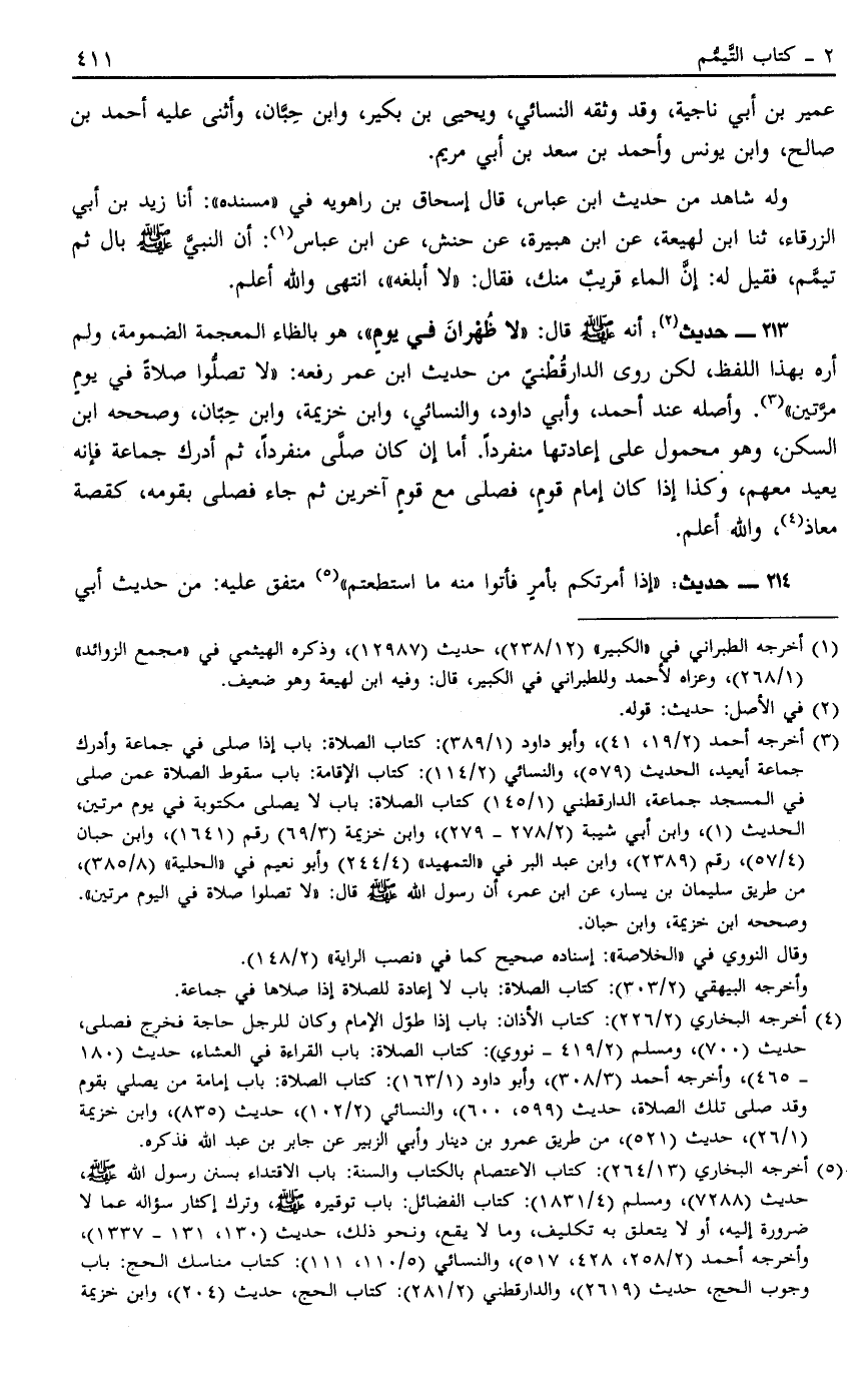 213 - حَدِيثُ2 أَنَّهُ صَلَّى اللَّهُ عَلَيْهِ وَسَلَّمَ قَالَ: "لَا ظُهْرَانِ فِي يَوْمٍ" هُوَ بِالظَّاءِ الْمُعْجَمَةِ الْمَضْمُومَةِ وَلَمْ أَرَهُ بِهَذَا اللَّفْظِ لَكِنْ رَوَى الدَّارَقُطْنِيُّ مِنْ حَدِيثِ ابْنِ عُمَرَ رَفَعَهُ: "لَا تُصَلُّوا صَلَاةً فِي يَوْمٍ مَرَّتَيْنِ" 3 وَأَصْلُهُ عِنْدَ أَحْمَدَ وَأَبِي دَاوُد وَالنَّسَائِيِّ وَابْنِ خُزَيْمَةَ وَابْنِ حِبَّانَ وَصَحَّحَهُ ابْنُ السَّكَنِ وَهُوَ مَحْمُولٌ عَلَى إعَادَتِهَا مُنْفَرِدًا أَمَّا إنْ كَانَ صَلَّى مُنْفَرِدًا ثُمَّ أَدْرَكَ جَمَاعَةً فَإِنَّهُ يُعِيدُ مَعَهُمْ وَكَذَا إذَا كَانَ إمَامَ قَوْمٍ فَصَلَّى مَعَ قَوْمٍ آخَرِينَ ثُمَّ جَاءَ فَصَلَّى بِقَوْمِهِ كَقِصَّةِ مُعَاذٍ4 وَاَللَّهُ أَعْلَمُ
