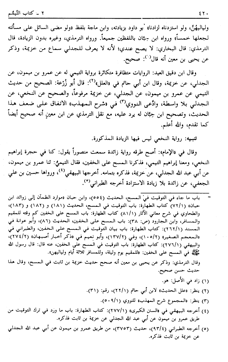وَقَالَ فِي الْإِمَامِ أَصَحُّ طُرُقِهِ رِوَايَةُ زَائِدَةَ سَمِعْتُ مَنْصُورًا يَقُولُ كُنَّا فِي حُجْرَةِ إبْرَاهِيمَ النَّخَعِيِّ وَمَعَنَا إبْرَاهِيمُ التَّيْمِيُّ فَذَكَرْنَا الْمَسْحَ عَلَى الْخُفَّيْنِ فَقَالَ التَّيْمِيُّ ثَنَا عَمْرُو بْنُ مَيْمُونٍ عَنْ أَبِي عَبْدِ اللَّهِ الْجَدَلِيِّ عَنْ خُزَيْمَةَ فَذَكَرَهُ بِتَمَامِهِ أَخْرَجَهَا الْبَيْهَقِيّ4 وَرَوَاهَا حُسَيْنُ بْنُ عَلِيٍّ الْجُعْفِيُّ عَنْ زَائِدَةَ بِلَا زِيَادَةِ الِاسْتِزَادَةِ أَخْرَجَهُ الطَّبَرَانِيُّ5
