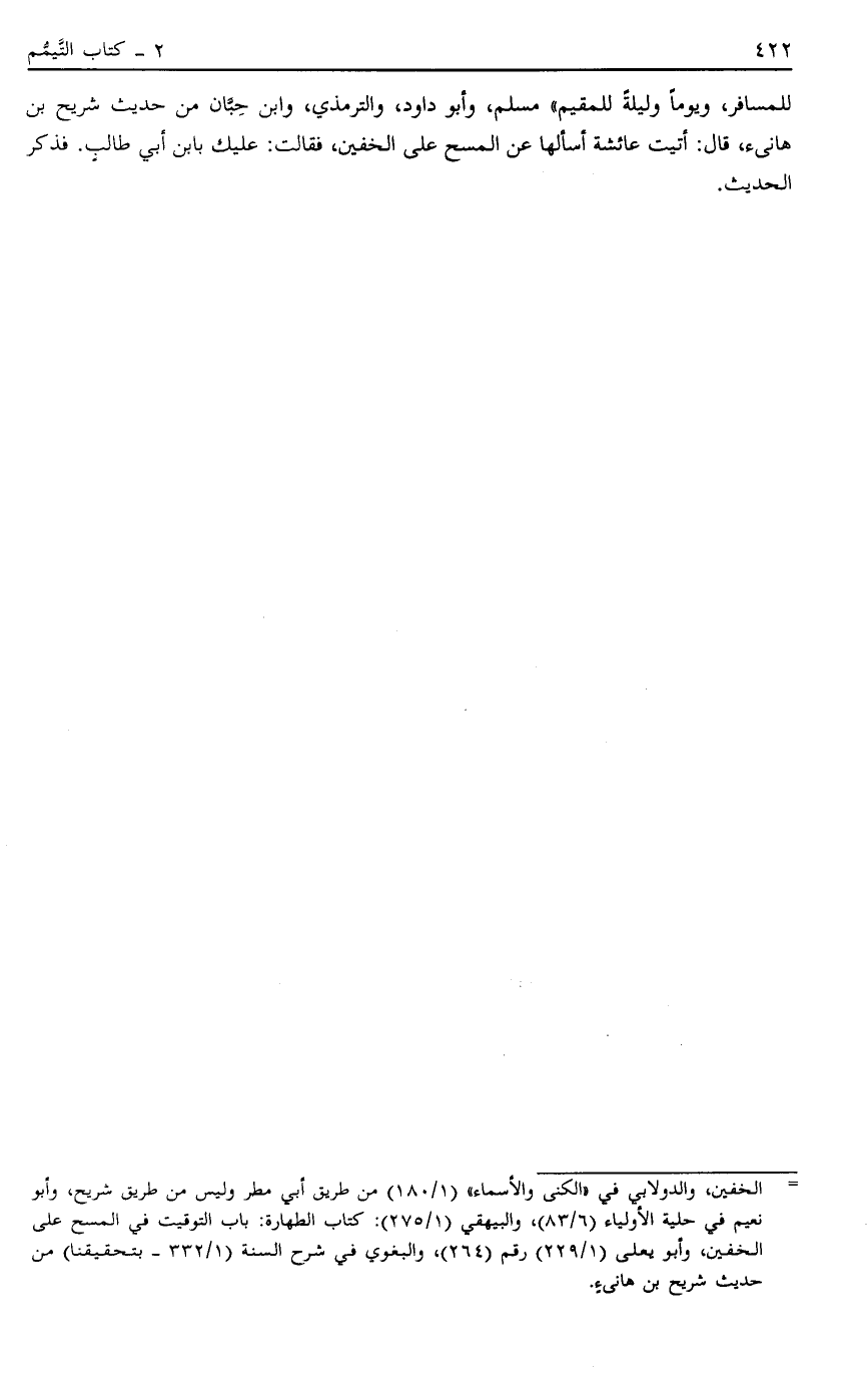 = الخفين، والدولابي في "الكنى والأسماء" "1/180" من طريق أبي مطر وليس من طريق شريح، وأبو نعيم في حلية الأولياء "6/83"، والبيهقي "1/275": كتاب الطهارة: باب التوقيت في المسح على الخفين، وأبو يعلى "1/229" رقم "264"، والبغوي في شرح السنة "1/332- بتحقيقنا" من حديث شريح بن هانىءِ.