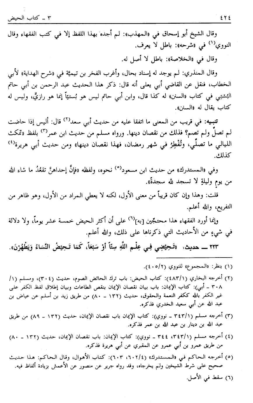 وَإِنَّمَا أَوْرَدَ الْفُقَهَاءُ هَذَا مُحْتَجِّينَ بِهِ6 عَلَى أَنَّ أكثر الحيض خسمة عَشَرَ يَوْمًا وَلَا دَلَالَةَ فِي شَيْءٍ مِنْ الْأَحَادِيثِ الَّتِي ذَكَرْنَاهَا عَلَى ذَلِكَ وَاَللَّهُ أَعْلَمُ