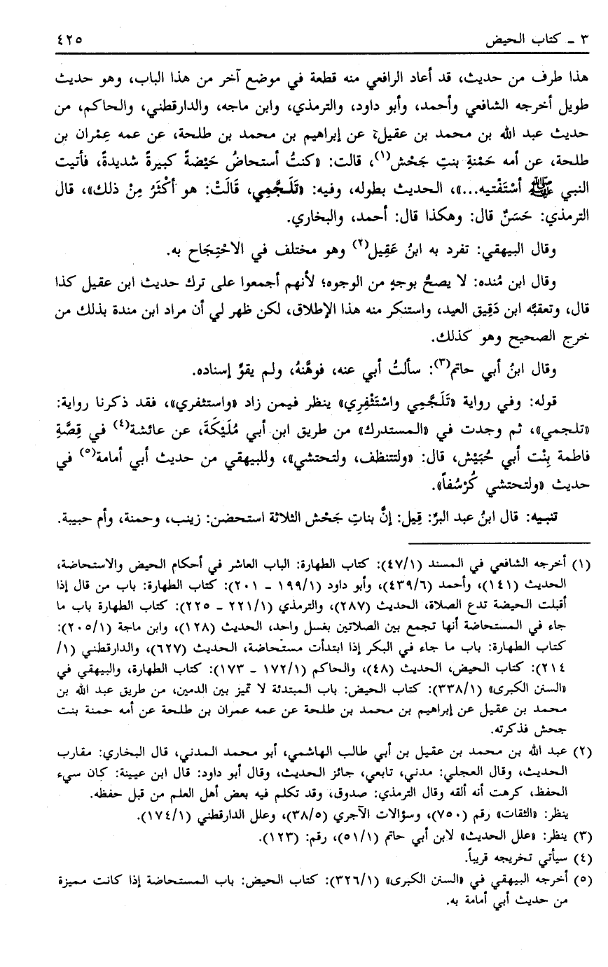 هَذَا طَرَفٌ مِنْ حَدِيثٍ قَدْ أَعَادَ الرَّافِعِيُّ مِنْهُ قِطْعَةً فِي موضع أُخَرَ مِنْ هَذَا الْبَابِ وَهُوَ حَدِيثٌ طَوِيلٌ أَخْرَجَهُ الشَّافِعِيُّ وَأَحْمَدُ وَأَبُو دَاوُد وَالتِّرْمِذِيُّ وَابْنُ مَاجَهْ وَالدَّارَقُطْنِيّ وَالْحَاكِمُ مِنْ حَدِيثِ عَبْدِ اللَّهِ بْنِ مُحَمَّدِ بْنِ عَقِيلٍ عَنْ إبْرَاهِيمَ بْنِ مُحَمَّدِ بْنِ طَلْحَةَ عَنْ عَمِّهِ عِمْرَانَ بْنِ طَلْحَةَ عَنْ أُمِّهِ حَمْنَةَ بِنْتِ جَحْشٍ1 قَالَتْ كُنْتُ أُسْتَحَاضُ حَيْضَةً كَبِيرَةً شَدِيدَةً فَأَتَيْتُ النَّبِيَّ صَلَّى اللَّهُ عَلَيْهِ وَسَلَّمَ أَسْتَفْتِيهِ الْحَدِيثَ بِطُولِهِ وَفِيهِ: "تَلَجَّمِي" قَالَتْ: هُوَ أَكْثَرُ مِنْ ذَلِكَ, قَالَ التِّرْمِذِيُّ حَسَنٌ قَالَ: وَهَكَذَا قَالَ أَحْمَدُ وَالْبُخَارِيُّ