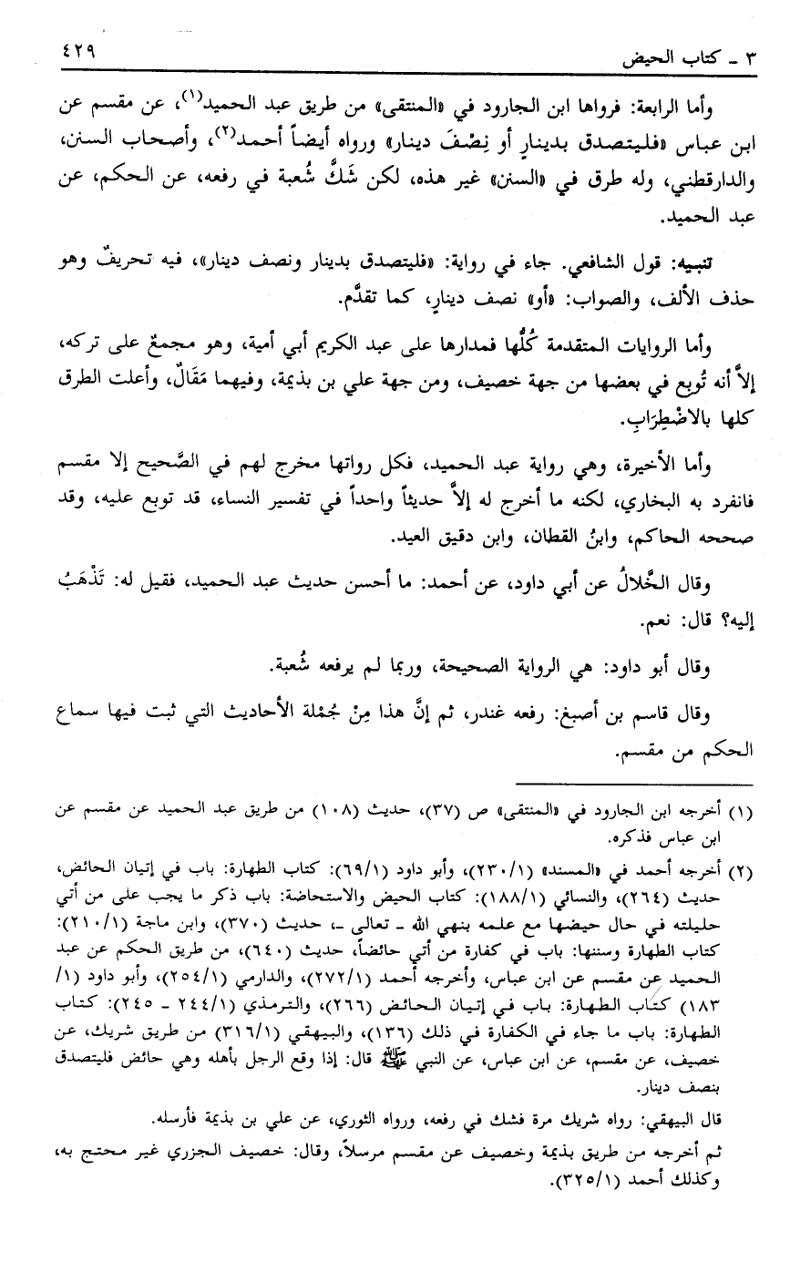 2 أخرجه أحمد في " المسند" "1/230"، وأبو داود "1/69": كتاب الطهارة: باب في إتيان الحائض، حديث "264"، والنسائي "1/188": كتاب الحيض والاستحاضة: باب ذكر ما يجب على من أتي حليلته في حال حيضها مع علمه بنهي الله- تعالى-، حديث "370"، وابن ماجة "1/210": كتاب الطهارة وسننها: باب في كفارة من أتي حائضاً، حديث "640"، من طريق الحكم عن عبد الحميد عن مقسم عن ابن عباس، وأخرجه أحمد "1/272"، والدارمي "1/254"، وأبو داود "1/183" كتاب الطهارة: باب في إتيان الحائض "266"، والترمذي "1/244- 245": كتاب الطهارة: باب ما جاء في الكفارة في ذلك "136"، والبيهقي "1/316" من طريق شريك، عن خصيف، عن مقسم، عن ابن عباس، عن النبي صَلَّى اللَّهُ عَلَيْهِ وَسَلَّمَ قال: "إذا وقع الرجل بأهله وهي حائض فليتصدق بنصف دينار".