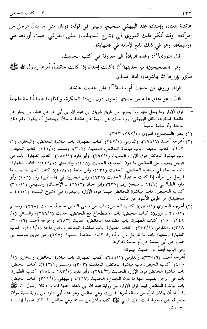 3 أخرجه البخاري "1/480": كتاب الحيض: باب من سمى النفاس حيضاً، حديث "298"، ومسلم "2/210- نووي": كتاب الحيض: باب الاضطجاع مع الحائض، حديث "5/296"، والنسائي "1/49 1، 150": كتاب الطهارة: باب مضاجعة الحائض، حديث "283"، وأخرجه أحمد "6/300، 318"، والدارمي "1/243": كتاب الطهارة: باب مباشرة الحائض، وابن ماجة "1/209": كتاب الطهارة وسننها: باب ما للرجل من امرأته إذا كانت حائضاً، حديث "637"، من طريق محمد بن عمرو عن أبي سلمة عن أم سلمة فذكرته.