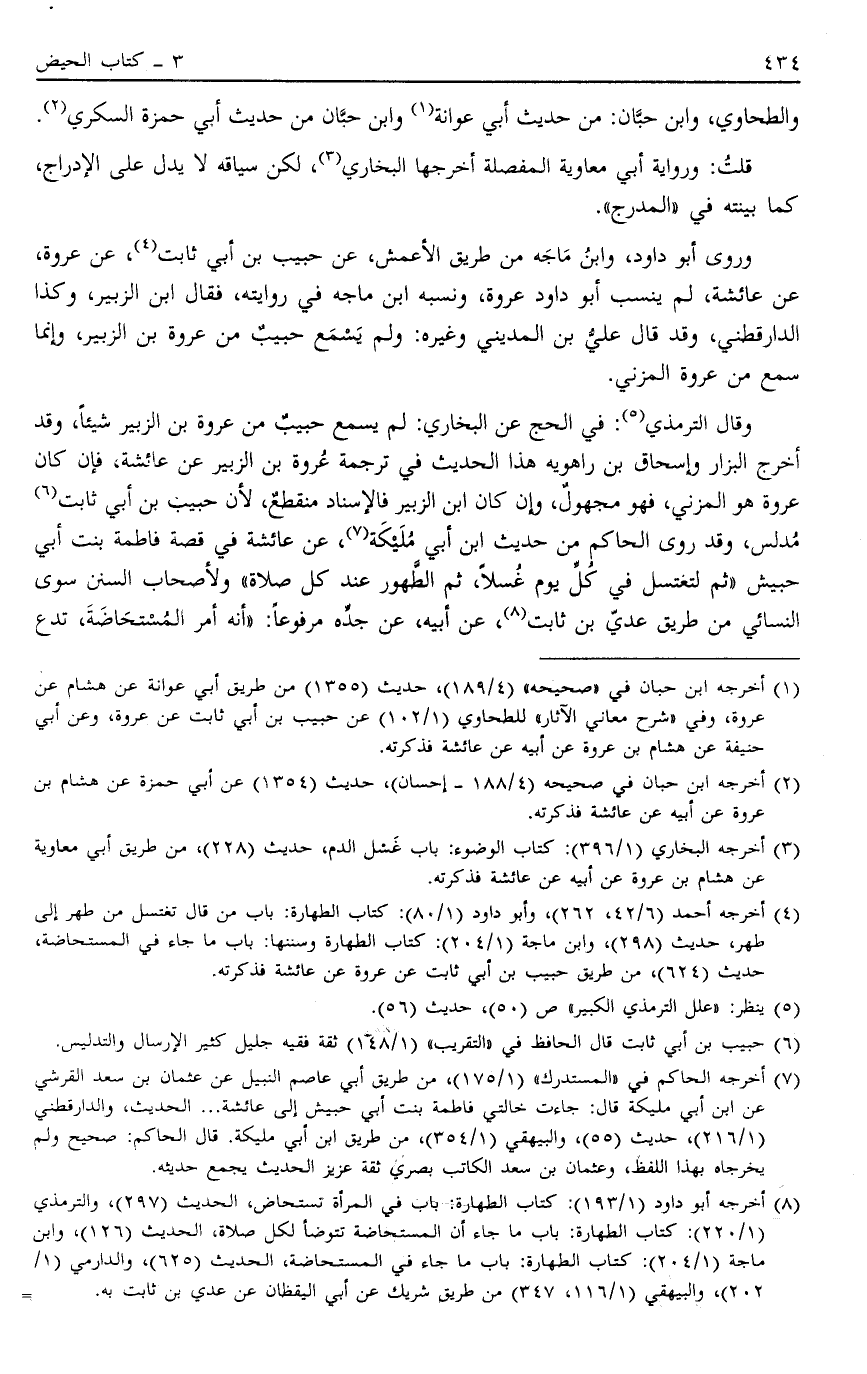 4 أخرجه أحمد "6/42، 262"، وأبو داود "1/80": كتاب الطهارة: باب من قال تغتسل من طهر إلى طهر، حديث "298"، وابن ماجة "1/204": كتاب الطهارة وسننها: باب ما جاء في المستحاضة، حديث "624"، من طريق حبيب بن أبي ثابت عن عروة عن عائشة فذكرته.