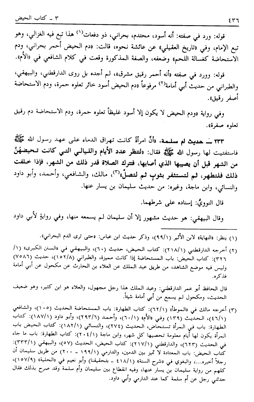 233 - حَدِيثُ أُمِّ سَلَمَةَ أَنَّ امْرَأَةً كَانَتْ تُهْرَاقُ الدِّمَاءَ عَلَى عَهْدِ رَسُولِ اللَّهِ صَلَّى اللَّهُ عَلَيْهِ وَسَلَّمَ فَاسْتَفْتَيْت لَهَا رَسُولَ اللَّهِ صَلَّى اللَّهُ عَلَيْهِ وَسَلَّمَ فَقَالَ: "لِتَنْظُرْ عَدَدَ الْأَيَّامِ وَاللَّيَالِيَ الَّتِي كَانَتْ تَحِيضُهُنَّ مِنْ الشَّهْرِ قَبْلَ أَنْ يُصِيبَهَا الَّذِي أَصَابَهَا فَلْتَتْرُكْ الصَّلَاةَ قَدْرَ ذَلِكَ مِنْ الشَّهْرِ فَإِذَا خَلَفَتْ ذَلِكَ فَلْتَطْهُرْ ثُمَّ لِتَسْتَثْفِرْ بِثَوْبٍ ثُمَّ لِتُصَلِّ" 3 مَالِكٌ وَالشَّافِعِيُّ وَأَحْمَدُ وَأَبُو دَاوُد وَالنَّسَائِيُّ وَابْنُ مَاجَهْ وَغَيْرُهُ مِنْ حَدِيثِ سُلَيْمَانَ بْنِ يَسَارٍ عَنْهَا