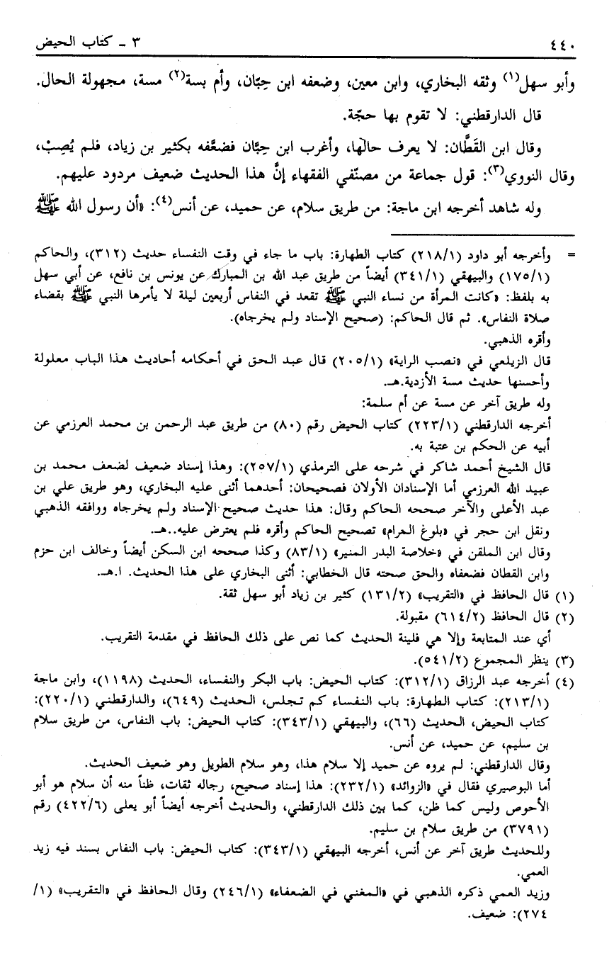 4 أخرجه عبد الرزاق "1/312": كتاب الحيض: باب البكر والنفساء، الحدث "198 1"، وابن ماجة "1/213": كتاب الطهارة: باب النفساء كم تجلس، الحديث "649"، والدارقطني "1/220": كتاب الحيض، الحديث "66"، والبيهقي "1/343": كتاب الحيض: باب النفاس، من طريق سلام بن سليم، عن حميد، عن أنس.