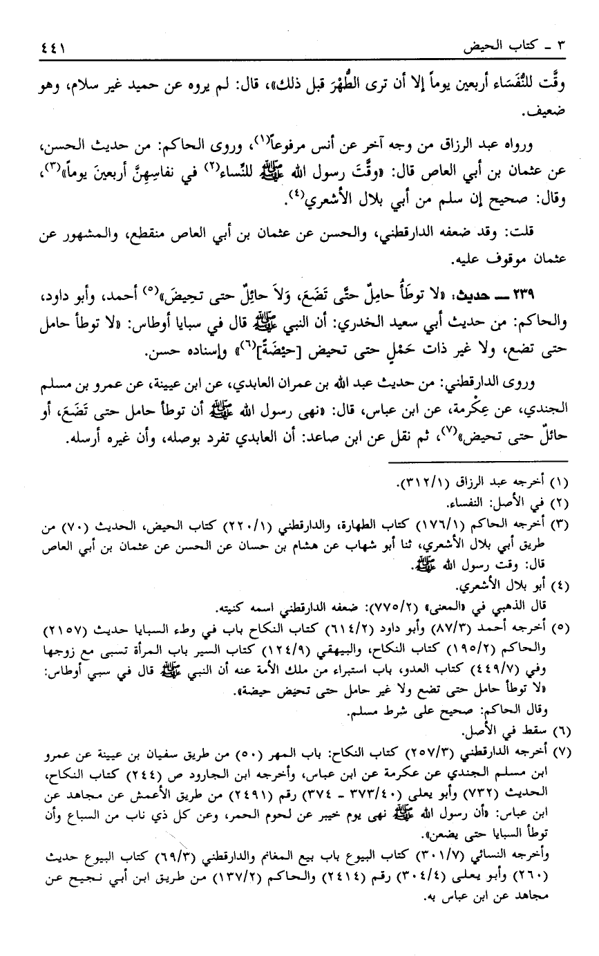 239 - حَدِيثُ: "لَا تُوطَأُ حَامِلٌ حَتَّى تَضَعَ وَلَا حَائِلٌ حَتَّى تَحِيضَ" 5 أَحْمَدُ وَأَبُو دَاوُد وَالْحَاكِمُ مِنْ حَدِيثِ أَبِي سَعِيدٍ الْخُدْرِيِّ أَنَّ النَّبِيَّ صَلَّى اللَّهُ عَلَيْهِ وَسَلَّمَ قَالَ فِي سَبَايَا أَوْطَاسٍ "لَا تُوطَأُ حَامِلٌ حَتَّى تَضَعَ وَلَا غَيْرُ ذَاتِ حَمْلٍ حَتَّى تَحِيضَ حَيْضَةً" 6 وَإِسْنَادُهُ حَسَنٌ
