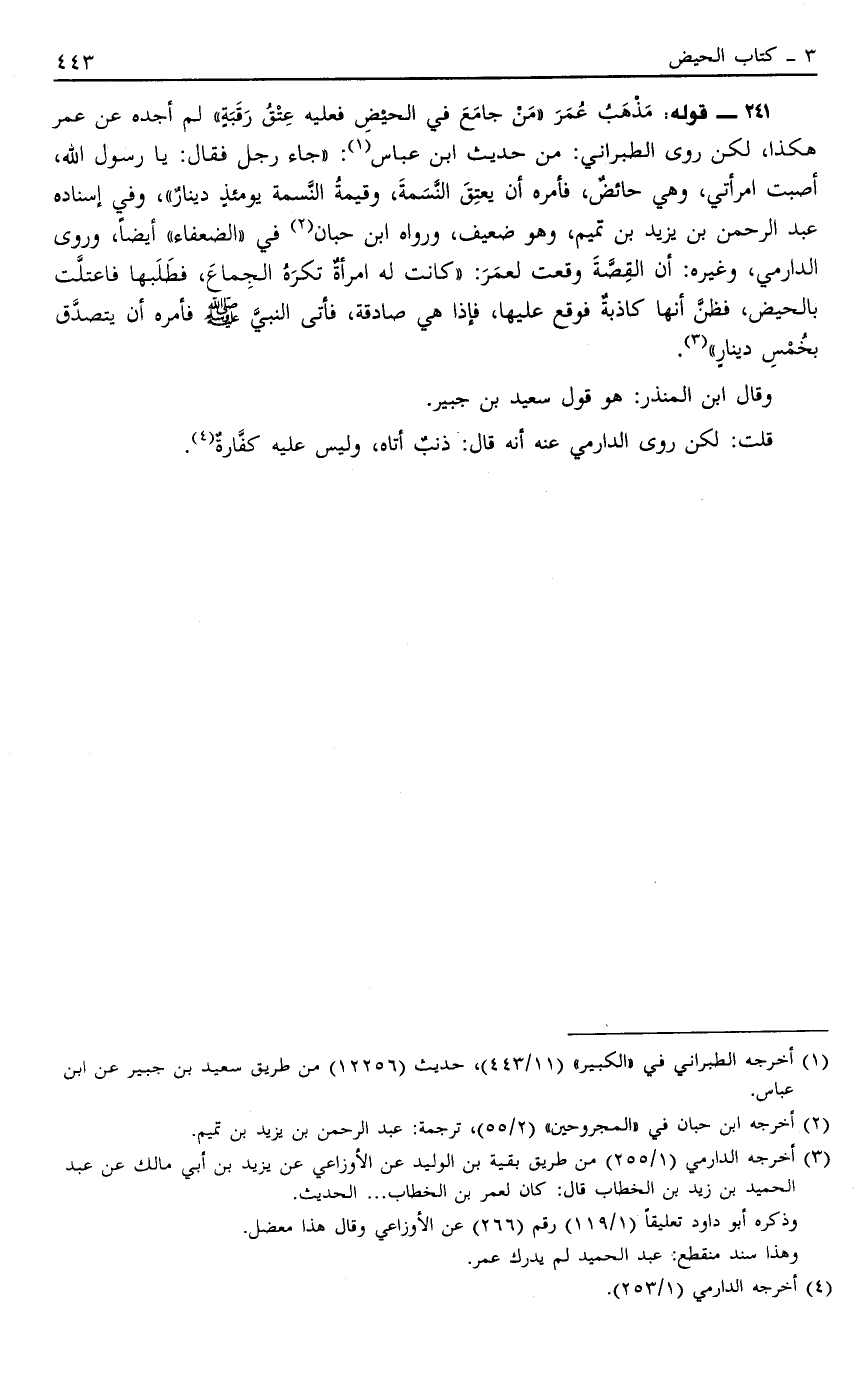 241 - قَوْلُهُ: مَذْهَبُ عُمَرَ "مَنْ جَامَعَ في الحيض عليه عِتْقُ رَقَبَةٍ" لَمْ أَجِدْهُ عَنْ عُمَرَ هَكَذَا لَكِنْ رَوَى الطَّبَرَانِيُّ مِنْ حَدِيثِ ابْنِ عَبَّاسٍ:1 جَاءَ رَجُلٌ فَقَالَ: يَا رَسُولَ اللَّهِ أَصَبْت امْرَأَتِي وَهِيَ حَائِضٌ, فَأَمَرَهُ أَنْ يُعْتِقَ النَّسَمَةَ وَقِيمَةُ النَّسَمَةِ يَوْمَئِذٍ دِينَارٌ وَفِي إسْنَادِهِ عَبْدُ الرَّحْمَنِ بْنُ يَزِيدَ بْنِ تَمِيمٍ وَهُوَ ضَعِيفٌ وَرَوَاهُ ابْنُ حِبَّانَ2 فِي الضُّعَفَاءِ أَيْضًا وَرَوَى الدَّارِمِيُّ وَغَيْرُهُ أَنَّ الْقِصَّةَ وَقَعَتْ لِعُمَرَ كَانَتْ لَهُ امْرَأَةٌ تَكْرَهُ الْجِمَاعَ فَطَلَبَهَا فَاعْتَلَّتْ بِالْحَيْضِ فَظَنَّ أَنَّهَا كَاذِبَةٌ فَوَقَعَ عَلَيْهَا فَإِذَا هِيَ صَادِقَةٌ فَأَتَى النَّبِيَّ صَلَّى اللَّهُ عَلَيْهِ وَسَلَّمَ فَأَمَرَهُ أَنْ يَتَصَدَّقَ بِخُمُسِ دِينَارٍ3