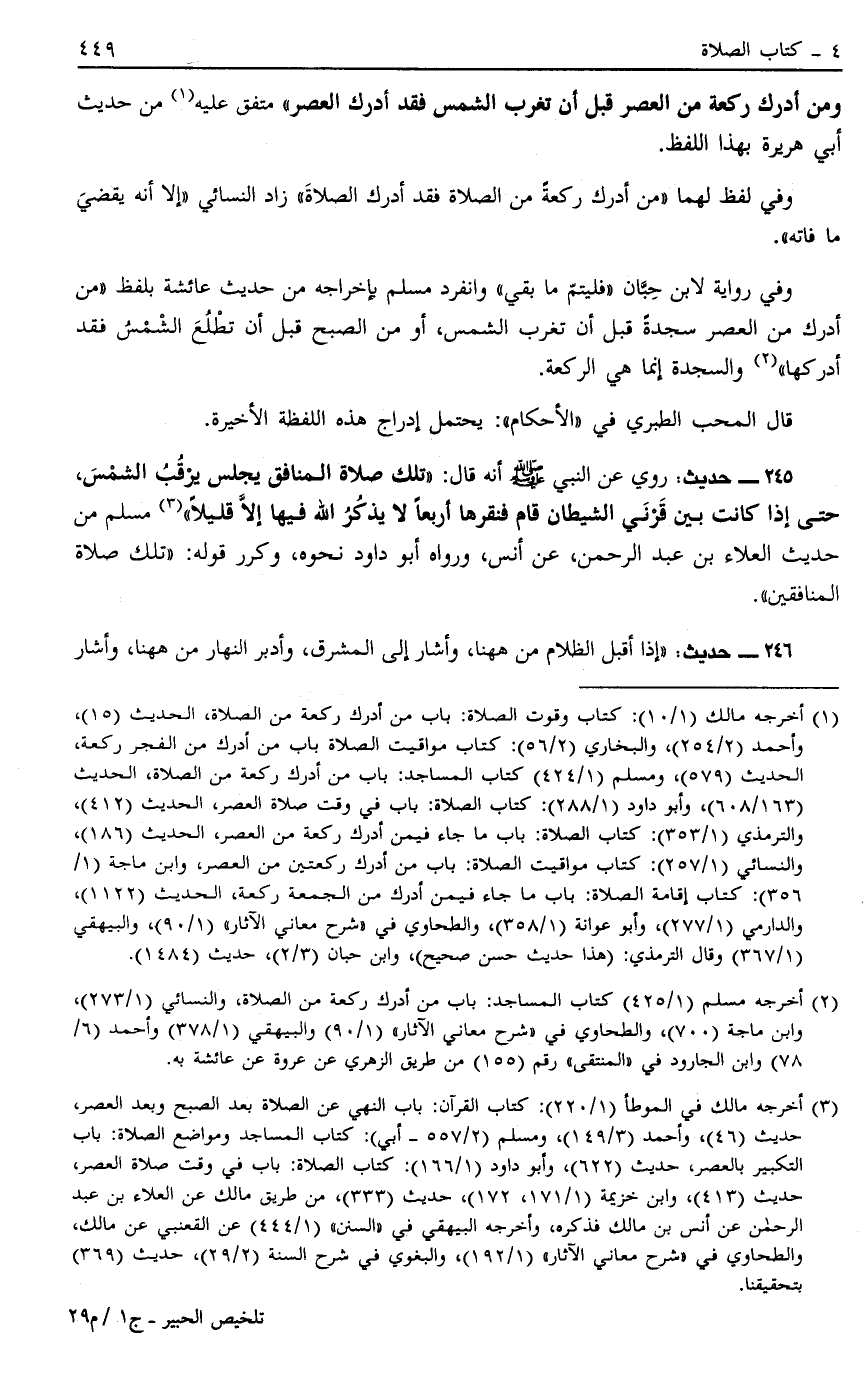 وَمَنْ أَدْرَكَ رَكْعَةً مِنْ الْعَصْرِ قَبْلَ أَنْ تَغْرُبَ الشَّمْسُ فَقَدْ أَدْرَكَ الْعَصْرَ" مُتَّفَقٌ عَلَيْهِ1 مِنْ حَدِيثِ أَبِي هُرَيْرَةَ بِهَذَا اللَّفْظِ