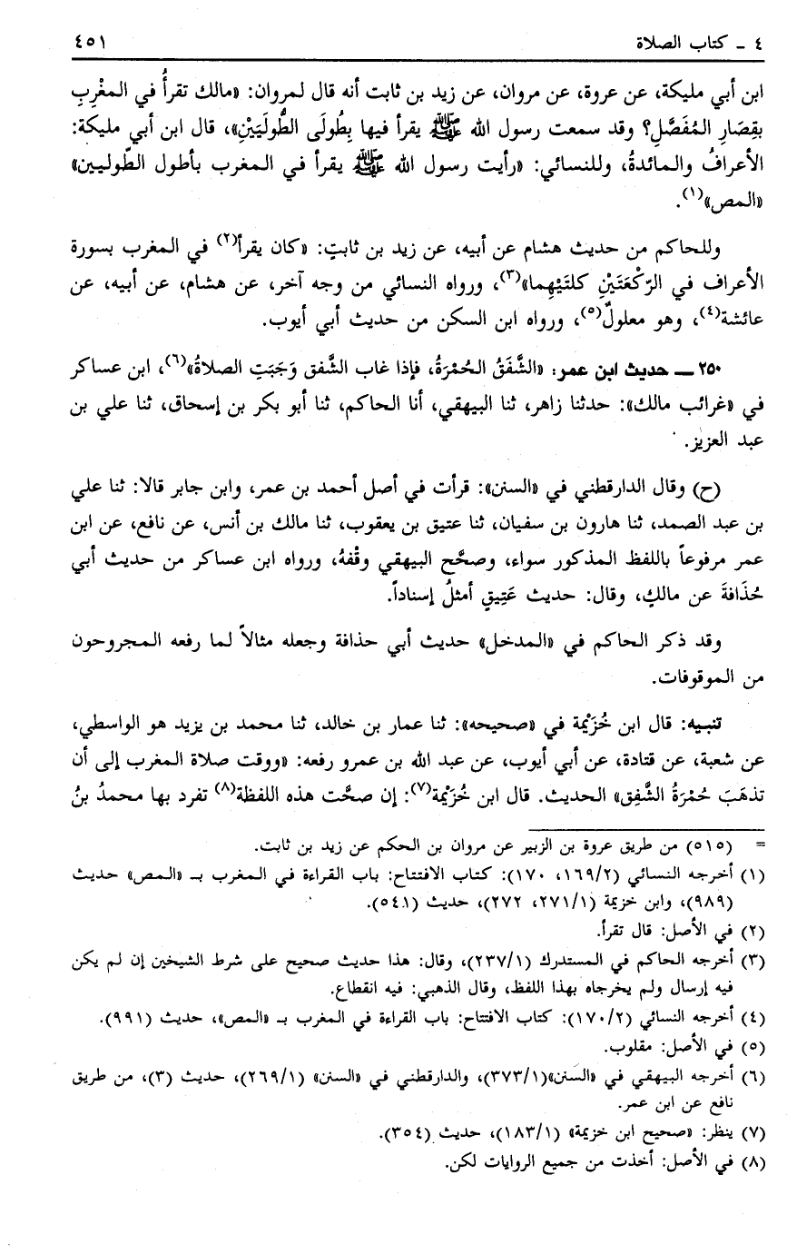 ابْنِ أَبِي مُلَيْكَةَ عَنْ عُرْوَةَ عَنْ مَرْوَانَ عَنْ زَيْدِ بْنِ ثَابِتٍ أنه قال لمروان: مالك تَقْرَأُ فِي الْمَغْرِبِ بِقِصَارِ الْمُفَصَّلِ؟ وَقَدْ سَمِعْت رَسُولَ اللَّهِ صَلَّى اللَّهُ عَلَيْهِ وَسَلَّمَ يَقْرَأُ فِيهَا بِطُولَى الطُّولَيَيْنِ. قَالَ ابْنُ أَبِي مُلَيْكَةَ الْأَعْرَافُ وَالْمَائِدَةُ وَلِلنَّسَائِيِّ: رَأَيْت رَسُولَ اللَّهِ صَلَّى اللَّهُ عَلَيْهِ وَسَلَّمَ يَقْرَأُ فِي الْمَغْرِبِ بِأَطْوَلِ الطُّولَيَيْنِ "المص"1