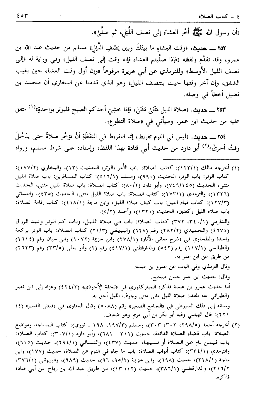 252 - حَدِيثٌ: "وَقْتُ الْعِشَاءِ مَا بَيْنَك وَبَيْنَ نِصْفِ اللَّيْلِ". مُسْلِمٌ مِنْ حَدِيثِ عَبْدِ اللَّهِ بْنِ عَمْرٍو وَقَدْ تَقَدَّمَ وَلَفْظُهُ: "فَإِذَا صَلَّيْتُمْ الْعِشَاءَ فَإِنَّهُ وَقْتٌ إلَى نِصْفِ اللَّيْلِ" وَفِي رِوَايَةٍ لَهُ: "إلَى نِصْفِ اللَّيْلِ الْأَوْسَطِ" وَلِلتِّرْمِذِيِّ عَنْ أَبِي هُرَيْرَةَ مَرْفُوعًا: "وَإِنَّ أَوَّلَ وَقْتِ الْعِشَاءِ حِينَ يَغِيبُ الشَّفَقُ وَإِنَّ آخِرَ وَقْتِهَا حِينَ يَنْتَصِفُ اللَّيْلُ" وَهُوَ الَّذِي قَدَّمْنَا عَنْ الْبُخَارِيِّ أَنَّ مُحَمَّدَ بْنَ فُضَيْلٍ أَخْطَأَ فِي وَصْلِهِ