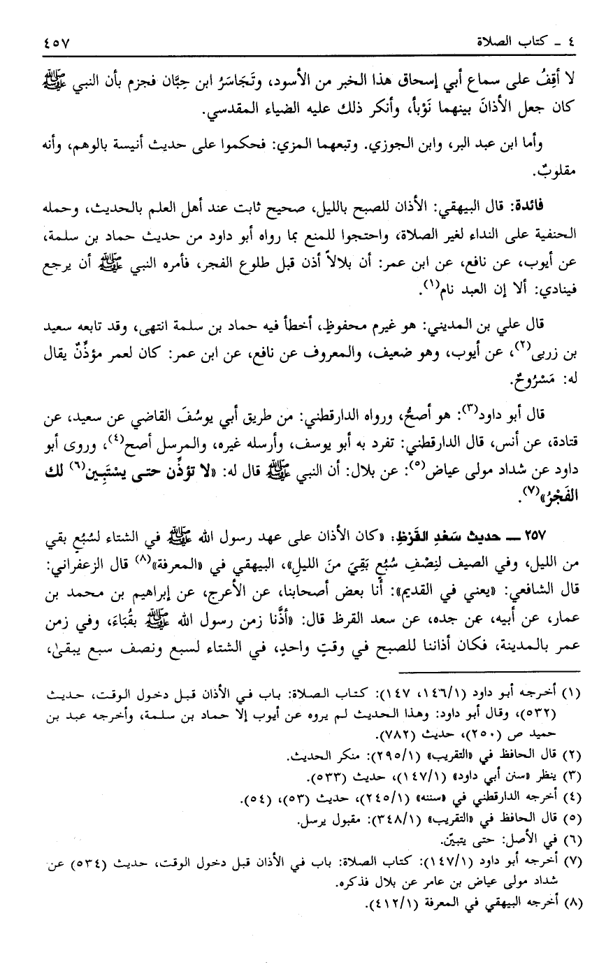 257 - حَدِيثُ سَعْدِ الْقَرَظِ: كَانَ الْأَذَانُ عَلَى عَهْدِ رَسُولِ اللَّهِ صَلَّى اللَّهُ عَلَيْهِ وَسَلَّمَ فِي الشِّتَاءِ لِسُبْعٍ بَقِيَ مِنْ اللَّيْلِ وَفِي الصَّيْفِ لِنِصْفِ سُبْعٍ بَقِيَ مِنْ اللَّيْلِ, الْبَيْهَقِيّ فِي الْمَعْرِفَةِ8 قَالَ الزَّعْفَرَانِيُّ قَالَ الشَّافِعِيُّ يَعْنِي فِي الْقَدِيمِ أَنَا بَعْضُ أَصْحَابِنَا عَنْ الْأَعْرَجِ عَنْ إبْرَاهِيمَ بْنِ مُحَمَّدِ بْنِ عَمَّارٍ عَنْ أَبِيهِ عَنْ جَدِّهِ عَنْ سَعْدِ الْقَرَظِ قَالَ: أَذَّنَّا زَمَنَ رَسُولِ اللَّهِ صَلَّى اللَّهُ عَلَيْهِ وَسَلَّمَ بِقُبَاءَ وَفِي زَمَنِ عُمَرَ بِالْمَدِينَةِ فَكَانَ أَذَانُنَا لِلصُّبْحِ فِي وَقْتٍ وَاحِدٍ فِي الشِّتَاءِ لِسُبْعٍ وَنِصْفِ سُبْعٍ يَبْقَى