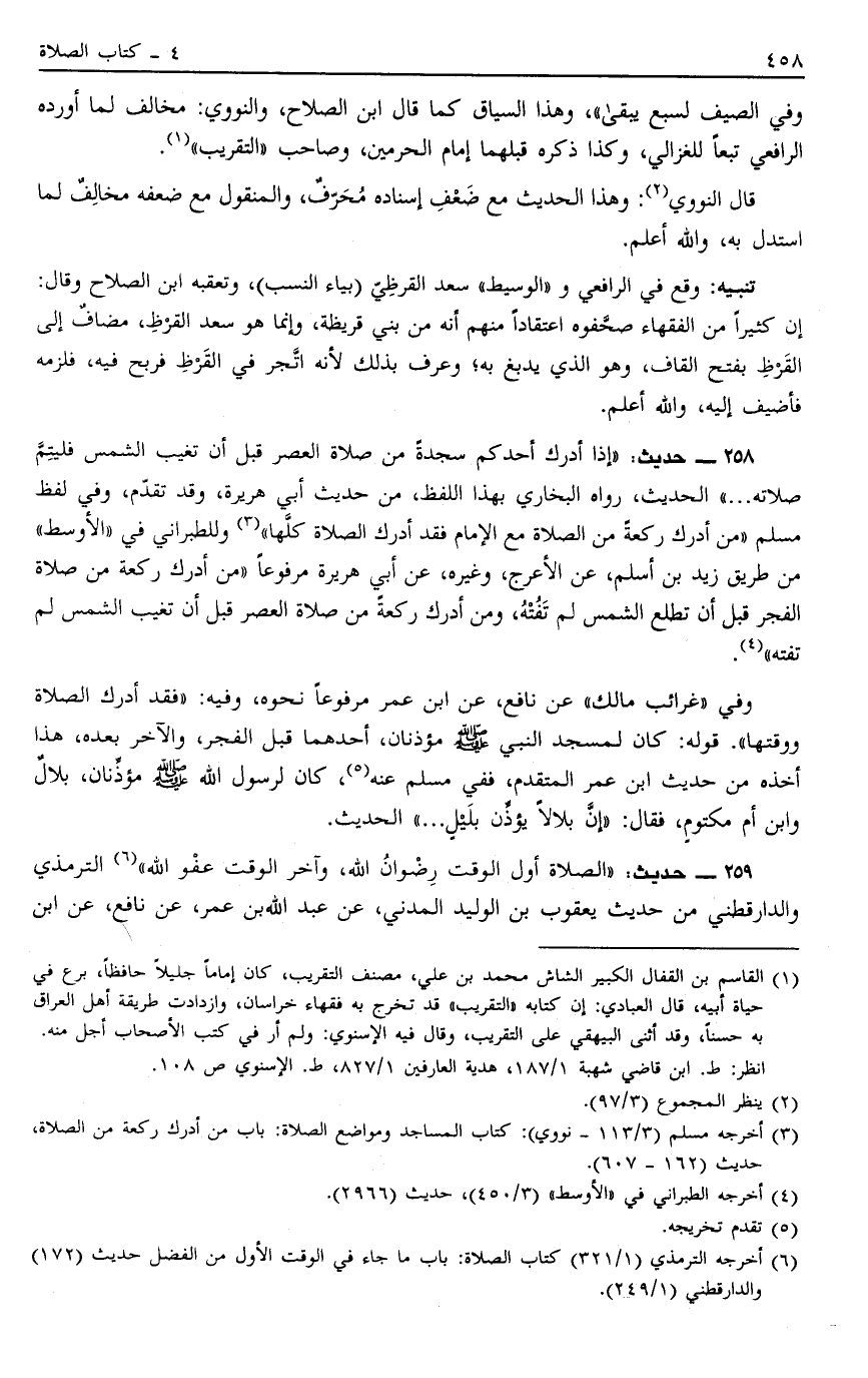258 - حَدِيثُ: "إذَا أَدْرَكَ أَحَدُكُمْ سَجْدَةً مِنْ صَلَاةِ الْعَصْرِ قَبْلَ أَنْ تَغِيبَ الشَّمْسُ فَلْيُتِمَّ صَلَاتَهُ ... " الْحَدِيثَ رَوَاهُ الْبُخَارِيُّ بِهَذَا اللَّفْظِ مِنْ حَدِيثِ أَبِي هُرَيْرَةَ وَقَدْ تَقَدَّمَ وَفِي لَفْظٍ لِمُسْلِمٍ: "مَنْ أَدْرَكَ رَكْعَةً مِنْ الصَّلَاةِ مَعَ الْإِمَامِ فَقَدْ أَدْرَكَ الصَّلَاةَ كُلَّهَا" 3 وَلِلطَّبَرَانِيِّ فِي الْأَوْسَطِ مِنْ طَرِيقِ زَيْدِ بْنِ أَسْلَمَ عَنْ الْأَعْرَجِ وَغَيْرِهِ عَنْ أَبِي هُرَيْرَةَ مَرْفُوعًا: "مَنْ أَدْرَكَ رَكْعَةً مِنْ صَلَاةِ الْفَجْرِ قَبْلَ أَنْ تَطْلُعَ الشَّمْسُ لَمْ تَفُتْهُ وَمَنْ أَدْرَكَ رَكْعَةً مِنْ صَلَاةِ الْعَصْرِ قَبْلَ أَنْ تَغِيبَ الشَّمْسُ لَمْ تَفُتْهُ" 4