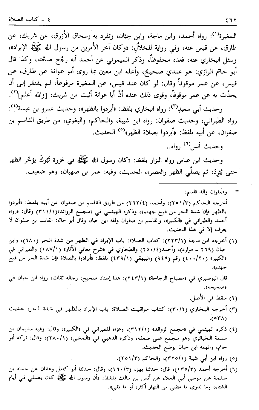 الْمُغِيرَةِ1 رَوَاهُ أَحْمَدُ وَابْنُ مَاجَهْ وَابْنُ حِبَّانَ وَتَفَرَّدَ بِهِ إِسْحَاقُ الْأَزْرَقُ عَنْ شَرِيكٍ عَنْ طَارِقٍ عَنْ قَيْسٍ عَنْهُ وَفِي رِوَايَةٍ لِلْخَلَّالِ: وَكَانَ آخِرُ الْأَمْرَيْنِ مِنْ رَسُولِ اللَّهِ صَلَّى اللَّهُ عَلَيْهِ وَسَلَّمَ الْإِبْرَادَ وَسُئِلَ الْبُخَارِيُّ عَنْهُ فَعَدَّهُ مَحْفُوظًا وَذَكَرَ الْمَيْمُونِيُّ عَنْ أَحْمَدَ أَنَّهُ رَجَّحَ صِحَّتَهُ وَكَذَا قَالَ أَبُو حَاتِمٍ الرَّازِيّ هُوَ عِنْدِي صَحِيحٌ وَأَعَلَّهُ ابْنُ مَعِينٍ بِمَا رَوَى أَبُو عَوَانَةَ عَنْ طَارِقٍ عَنْ قَيْسٍ عَنْ عُمَرَ مَوْقُوفًا وَقَالَ لَوْ كَانَ عِنْدَ قَيْسٍ عَنْ الْمُغِيرَةِ مَرْفُوعًا لَمْ يَفْتَقِرْ إلَى أَنْ يُحَدِّثَ بِهِ عَنْ عُمَرَ مَوْقُوفًا وَقَوَّى ذَلِكَ عِنْدَهُ أَنَّ أَبَا عَوَانَةَ أَثْبَتُ مِنْ شَرِيكٍ وَاَللَّهُ أَعْلَمُ2