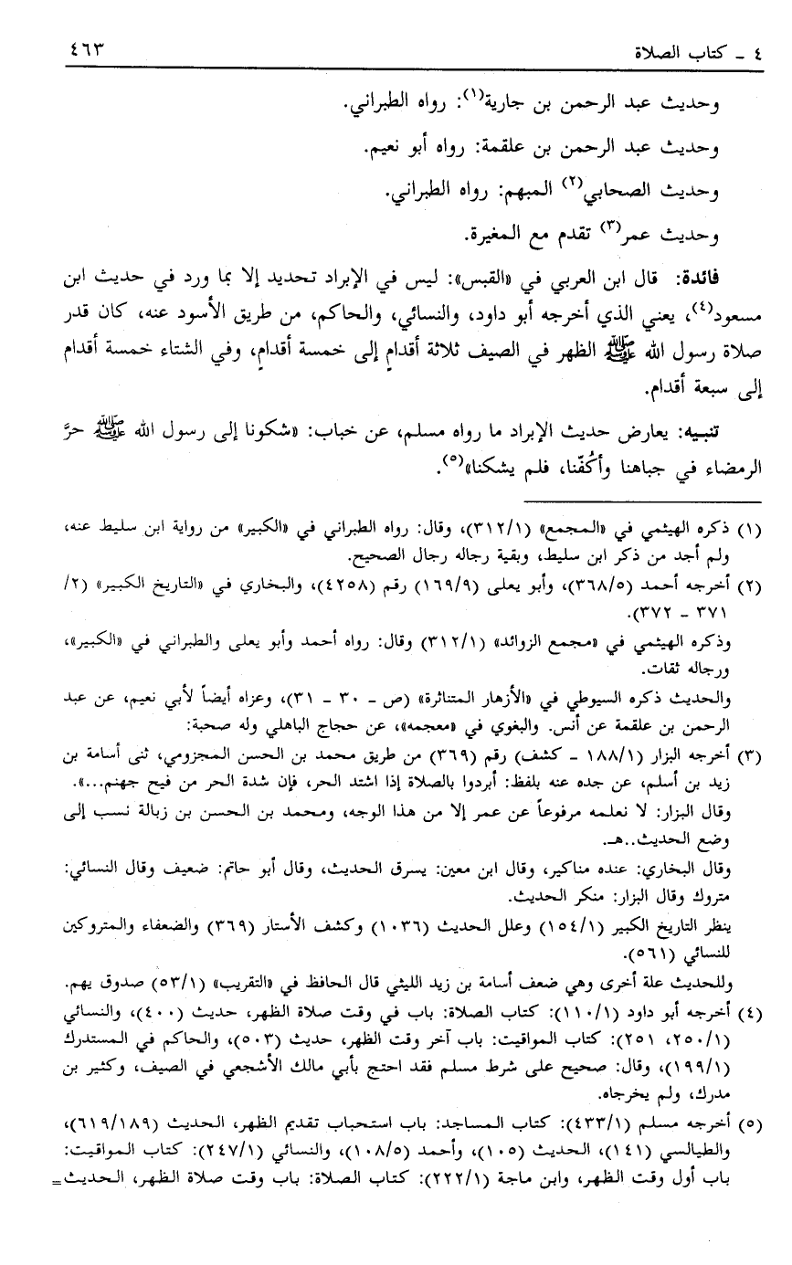 4 أخرجه أبو داود "1/110": كتاب الصلاة: باب في وقت صلاة الظهر، حديث "400"، والنسائي "1/250، 251": كتاب المواقيت: باب آخر وقت الظهر، حديث "503"، والحاكم في المستدرك "1/199"، وقال: صحيح على شرط مسلم فقد احتج بأبي مالك الأشجعي في الصيف، وكثير بن مدرك، ولم يخرجاه.