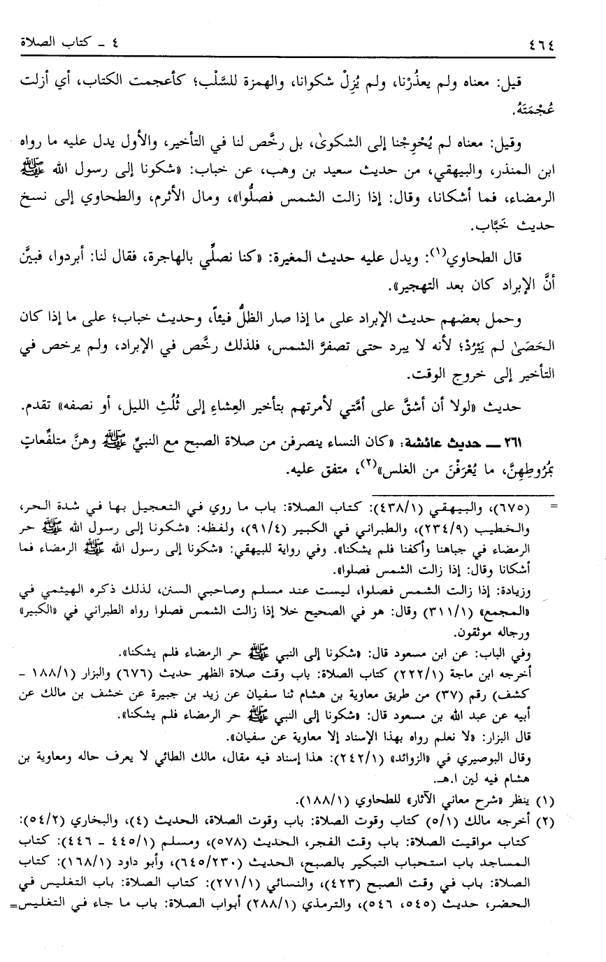 = "675"، والبيهقي "1/438": كتاب الصلاة: باب ما روي في التعجيل بها في شدة الحر، والخطيب "9/234"، والطبراني في الكبير "4/91"، ولفظه: "شكونا إلى رسول الله صَلَّى اللَّهُ عَلَيْهِ وَسَلَّمَ حر الرمضاء في جباهنا وأكفنا فلم يشكنا". وفي رواية للبيهقي: "شكونا إلى رسول الله صَلَّى اللَّهُ عَلَيْهِ وَسَلَّمَ الرمضاء فما أشكانا وقال: "إذا زالت الشمس فصلوا".