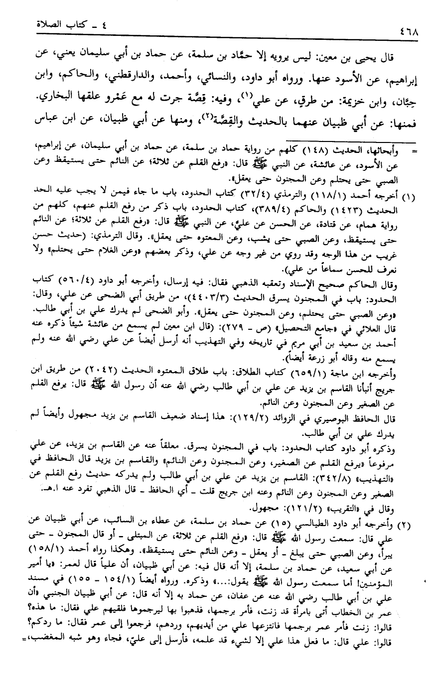 1 أخرجه أحمد "1/118" والترمذي "4/32" كتاب الحدود، باب ما جاء فيمن لا يجب عليه الحد الحديث "1423" والحاكم "4/389"، كتاب الحدود، باب ذكر من رفع القلم عنهم، كلهم من رواية همام، عن قتادة، عن الحسن عن علي، عن النبي صَلَّى اللَّهُ عَلَيْهِ وَسَلَّمَ قال: "رفع القلم عن ثلاثة؟ عن النائم حتى يستيقظ، وعن الصبي حتى يشب، وعن المعتوه حتى يعقل". وقال الترمذي: "حديث حسن غريب من هذا الوجه وقد روي من غير وجه عن علي، وذكر بعضهم "وعن الغلام حتى يحتلم" ولا نعرف للحسن سماعاً من علي".