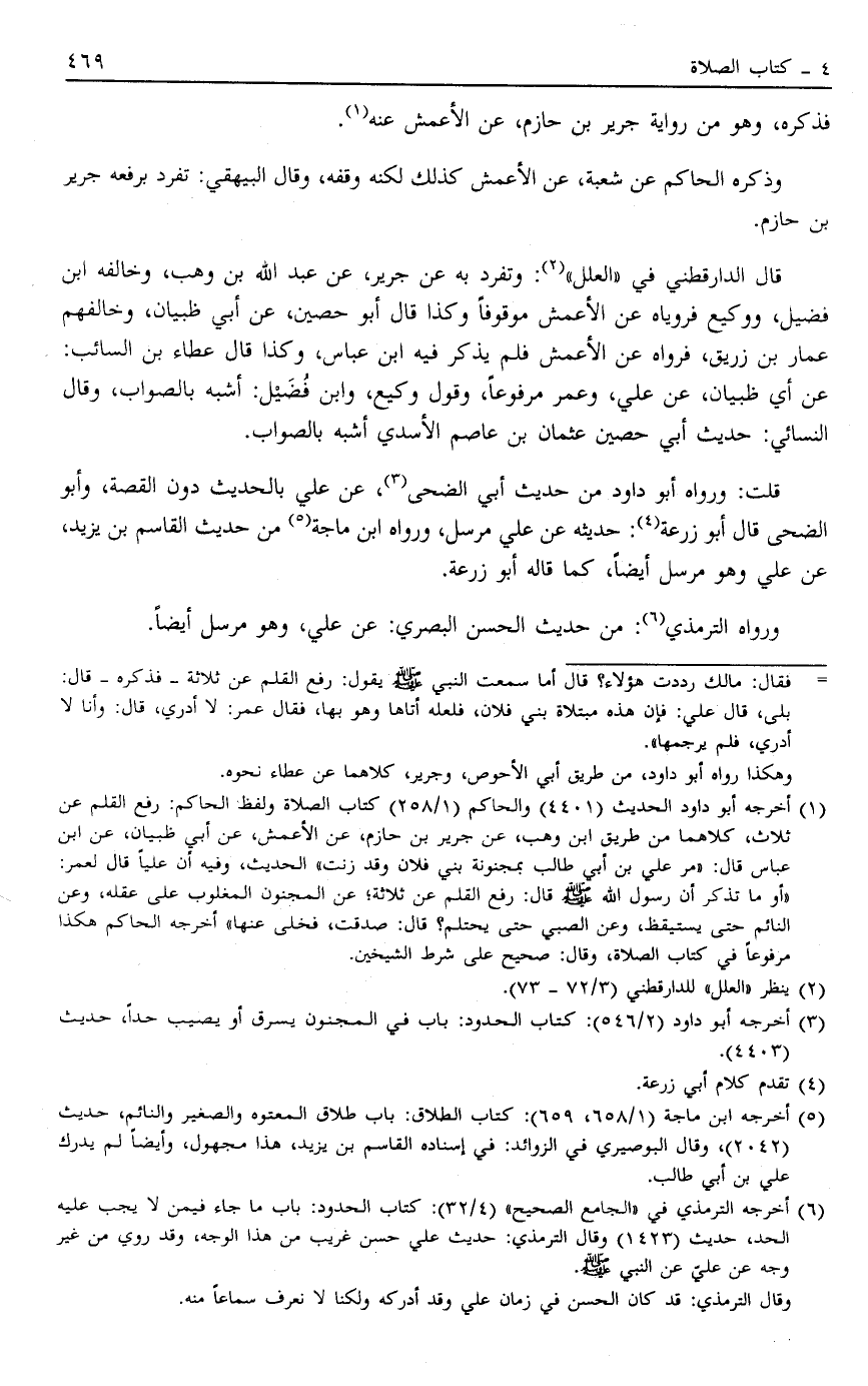 1 أخرجه أبو داود الحديث "4401" والحاكم "1/258" كتاب الصلاة ولفظ الحاكم: رفع القلم عن ثلاث، كلاهما من طريق ابن وهب، عن جرير بن حازم، عن الأعمش، عن أبي ظبيان، عن ابن عباس قال: "مر على بن أبي طالب بمجنونة بني فلان وقد زنت " الحديث، وفيه أن علياً قال لعمر: " أو ما تذكر أن رسول الله صَلَّى اللَّهُ عَلَيْهِ وَسَلَّمَ قال: "رفع القلم عن ثلاثة؟ عن المجنون المغلوب على عقله وعن النائم حتى يستيقظ، وعن الصبي حتى يحتلم"؛ قال: صدقت، فخلى عنها" أخرجه الحاكم هكذا مرفوعاً في كتاب الصلاة، وقال: صحيح على شرط الشيخين.