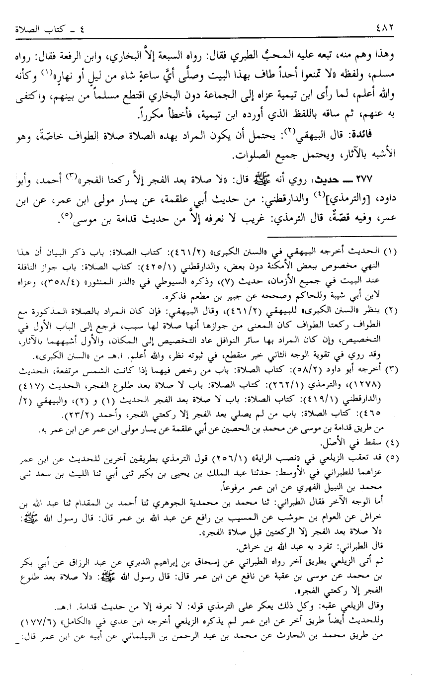 277 - حَدِيثٌ رُوِيَ أَنَّهُ صَلَّى اللَّهُ عَلَيْهِ وَسَلَّمَ قَالَ: "لَا صَلَاةَ بَعْدَ الْفَجْرِ 3 إلَّا رَكْعَتَا الْفَجْرِ". أَحْمَدُ وَأَبُو دَاوُد وَالتِّرْمِذِيُّ4 وَالدَّارَقُطْنِيُّ مِنْ حَدِيثِ أَبِي علقمة عن يَسَارٍ مَوْلَى ابْنِ عُمَرَ عَنْ ابْنِ عُمَرَ وَفِيهِ قِصَّةٌ قَالَ التِّرْمِذِيُّ غَرِيبٌ لَا نَعْرِفُهُ إلَّا مِنْ حَدِيثِ قُدَامَةَ بْنِ مُوسَى5