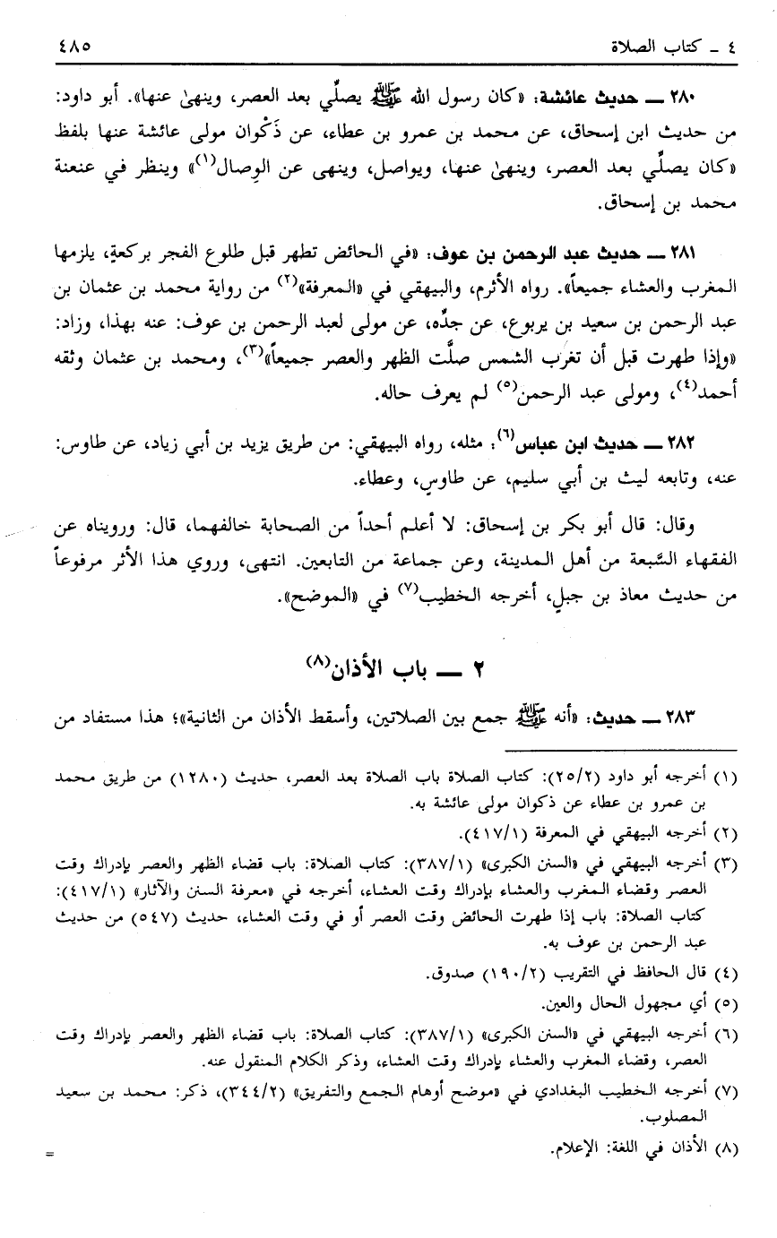280 - حَدِيثُ عَائِشَةَ: كَانَ رَسُولُ اللَّهِ صَلَّى اللَّهُ عَلَيْهِ وَسَلَّمَ يُصَلِّي بَعْدَ الْعَصْرِ وَيَنْهَى عَنْهَا أَبُو دَاوُد مِنْ حَدِيثِ ابْنِ إِسْحَاقَ عَنْ مُحَمَّدِ بْنِ عَمْرِو بْنِ عَطَاءٍ عَنْ ذَكْوَانَ مَوْلَى عَائِشَةَ عَنْهَا بِلَفْظِ: كَانَ يُصَلِّي الْعَصْرَ وَيَنْهَى عَنْهَا وَيُوَاصِلُ وَيَنْهَى عَنْ الْوِصَالِ1 وَيُنْظَرُ فِي عَنْعَنَةِ مُحَمَّدِ بْنِ إِسْحَاقَ