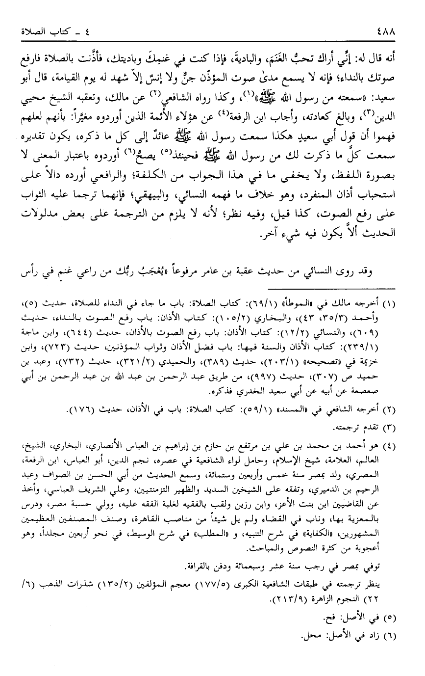 أَنَّهُ قَالَ لَهُ: "إنِّي أَرَاك تُحِبُّ الْغَنَمَ وَالْبَادِيَةَ فَإِذَا كُنْت فِي غَنَمِك وَبَادِيَتِك فَأَذَّنْت بِالصَّلَاةِ فَارْفَعْ صَوْتَك بِالنِّدَاءِ فَإِنَّهُ لَا يَسْمَعُ مَدَى صَوْتِ الْمُؤَذِّنِ جِنٌّ وَلَا إنْسٌ إلَّا شَهِدَ لَهُ يَوْمَ الْقِيَامَةِ". قَالَ أَبُو سَعِيدٍ سَمِعْته مِنْ رَسُولِ اللَّهِ صَلَّى اللَّهُ عَلَيْهِ وَسَلَّمَ1 وَكَذَا رَوَاهُ الشَّافِعِيُّ2 عَنْ مَالِكٍ وَتَعَقَّبَهُ الشَّيْخُ مُحْيِي الدِّينِ3 وَبَالَغَ كَعَادَتِهِ وَأَجَابَ ابْنُ الرِّفْعَةِ4 عَنْ هَؤُلَاءِ الْأَئِمَّةِ الَّذِينَ أَوْرَدُوهُ مُغَيَّرًا بِأَنَّهُمْ لَعَلَّهُمْ فَهِمُوا أَنَّ قَوْلَ أَبِي سَعِيدٍ هَكَذَا سَمِعْت رَسُولَ اللَّهِ صَلَّى اللَّهُ عَلَيْهِ وَسَلَّمَ عَائِدٌ إلَى كُلِّ مَا ذَكَرَهُ يَكُونُ تَقْدِيرُهُ سَمِعْت كُلَّ مَا ذَكَرْت لَك مِنْ رَسُولِ اللَّهِ صَلَّى اللَّهُ عَلَيْهِ وَسَلَّمَ فَحِينَئِذٍ5 يَصِحُّ6 مَا أَوْرَدُوهُ بِاعْتِبَارِ الْمَعْنَى لَا بِصُورَةِ اللَّفْظِ وَلَا يَخْفَى مَا فِي هَذَا الْجَوَابِ مِنْ الْكُلْفَةِ وَالرَّافِعِيُّ أَوْرَدَهُ دَالًّا عَلَى اسْتِحْبَابِ أَذَانِ الْمُنْفَرِدِ وَهُوَ خِلَافُ مَا فَهِمَهُ النَّسَائِيُّ وَالْبَيْهَقِيُّ فَإِنَّهُمَا تَرْجَمَا عَلَيْهِ الثَّوَابَ عَلَى رَفْعِ الصَّوْتِ كَذَا قِيلَ وَفِيهِ نَظَرٌ لِأَنَّهُ لَا يَلْزَمُ مِنْ التَّرْجَمَةِ عَلَى بَعْضِ مدلولات الحديث أن لا يَكُونَ فِيهِ شَيْءٌ آخَرُ