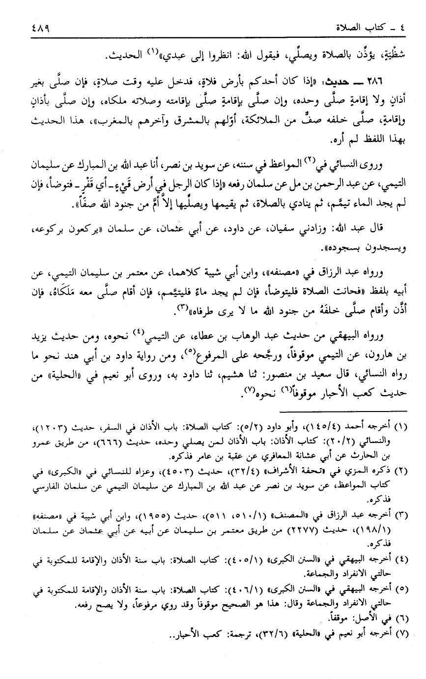 وَرَوَى النَّسَائِيُّ فِي2 الْمَوَاعِظِ مِنْ سُنَنِهِ عَنْ سُوَيْد بْنِ نَصْرٍ أَنَا عَبْدُ اللَّهِ بْنُ الْمُبَارَكِ عَنْ سُلَيْمَانَ التَّيْمِيِّ عَنْ عَبْدِ الرَّحْمَنِ بْنِ مُلٍّ عَنْ سَلْمَانَ رَفَعَهُ: "إذَا كَانَ الرَّجُلُ فِي أرض قيء أَيْ قَفْرٍ فَتَوَضَّأَ فَإِنْ لَمْ يَجِدْ الْمَاءَ تَيَمَّمَ ثُمَّ يُنَادِي بِالصَّلَاةِ ثُمَّ يُقِيمُهَا وَيُصَلِّيهَا إلَّا أَمَّ مِنْ جُنُودِ اللَّهِ صَفًّا".