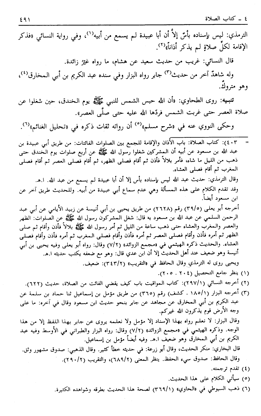 = 403": كتاب الصلاة: باب الأذان والإقامة للجمع بين الصلوات الفائتات: من طريق أبي عبيدة بن عبد الله بن مسعود عن أبيه أن المشركين شغلوا رسول الله صَلَّى اللَّهُ عَلَيْهِ وَسَلَّمَ عن أربع صلوات يوم الخندق حتى ذهب من الليل ما شاء، فأمر بلالاً فأذن ثم أقام فصلى الظهر، ثم أقام فصلى العصر ثم أقام فصلى المغرب ثم أقام فصلى العشاء.