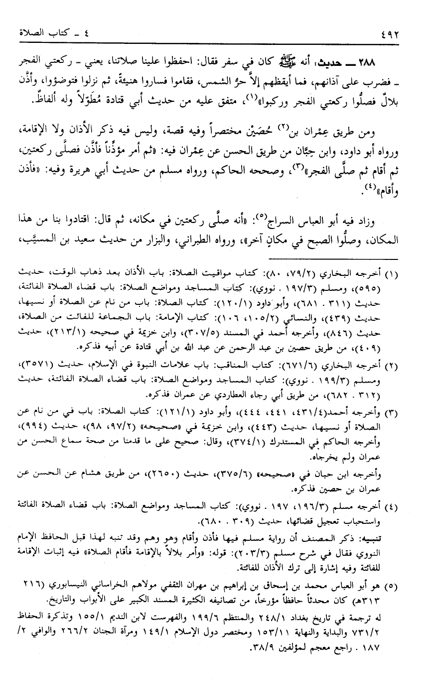 288 - حَدِيثُ أَنَّهُ صَلَّى اللَّهُ عَلَيْهِ وَسَلَّمَ كَانَ فِي سَفَرٍ فَقَالَ: "احْفَظُوا عَلَيْنَا صَلَاتَنَا" - يَعْنِي رَكْعَتَيْ الْفَجْرِ فَضُرِبَ عَلَى آذَانِهِمْ فَمَا أَيْقَظَهُمْ إلَّا حَرُّ الشَّمْسِ فَقَامُوا فَسَارُوا هنيئة ثم نزلوا فتوضؤوا وَأَذَّنَ بِلَالٌ فَصَلُّوا رَكْعَتَيْ الْفَجْرِ وَرَكِبُوا1 مُتَّفَقٌ عَلَيْهِ مِنْ حَدِيثِ أَبِي قَتَادَةَ مُطَوَّلًا وَلَهُ أَلْفَاظٌ