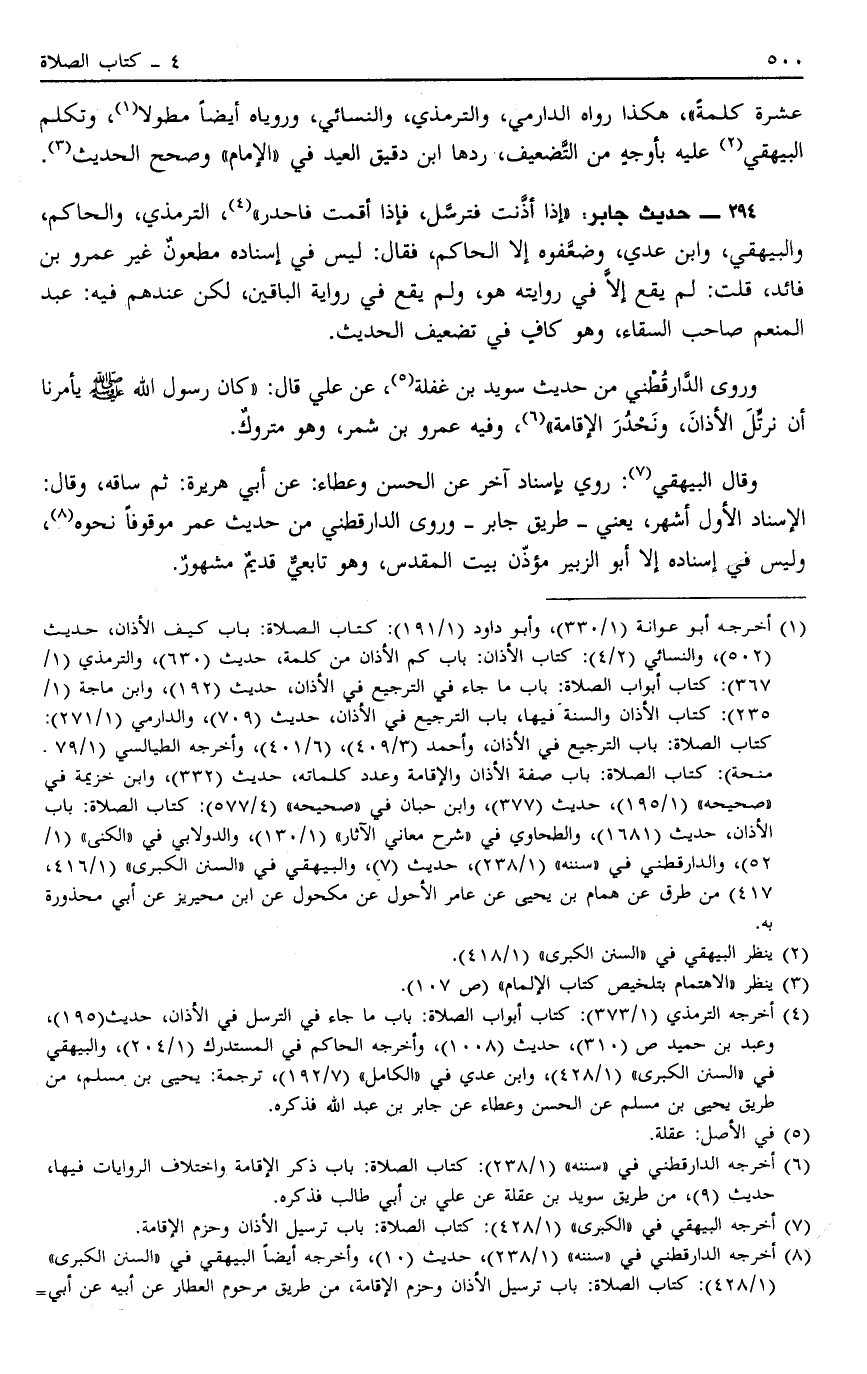 294 - حَدِيثُ جَابِرٍ: إذَا أَذَّنْتَ فَتَرَسَّلْ فَإِذَا أَقَمْتَ فَاحْدُرْ.4 التِّرْمِذِيُّ وَالْحَاكِمُ وَالْبَيْهَقِيُّ وَابْنُ عَدِيٍّ وَضَعَّفُوهُ إلَّا الْحَاكِمُ فَقَالَ لَيْسَ فِي إسْنَادِهِ مَطْعُونٌ غَيْرُ عَمْرِو بْنِ فَائِدٍ قُلْتُ: لَمْ يَقَعْ إلَّا فِي رِوَايَتِهِ هُوَ وَلَمْ يَقَعْ فِي رِوَايَةِ الْبَاقِينَ لَكِنْ عِنْدَهُمْ فِيهِ عَبْدُ الْمُنْعِمِ صَاحِبُ السِّقَاءِ وَهُوَ كَافٍ فِي تَضْعِيفِ الْحَدِيثِ