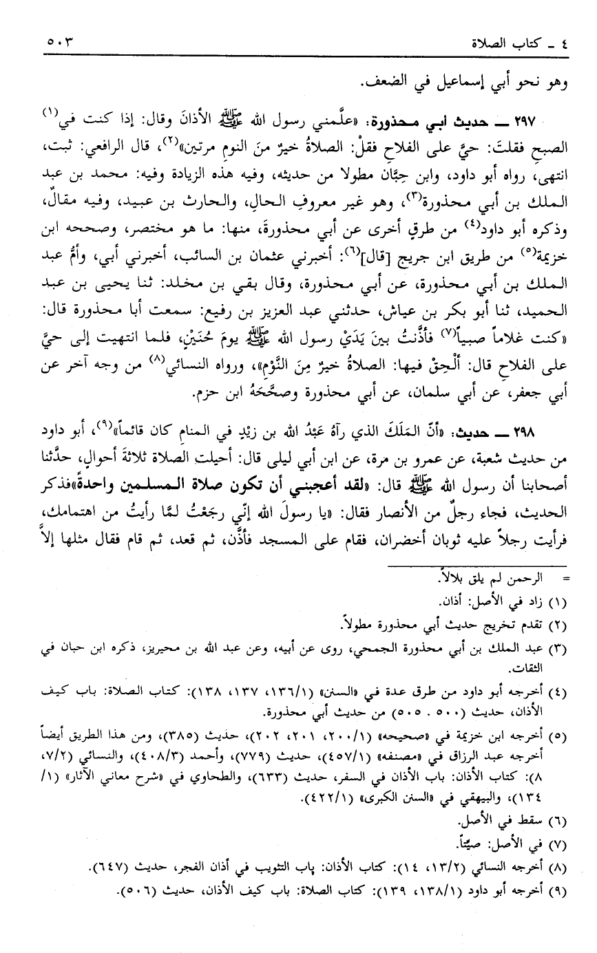 297 - حَدِيثُ أَبِي مَحْذُورَةَ: "عَلَّمَنِي رَسُولُ اللَّهِ صَلَّى اللَّهُ عَلَيْهِ وَسَلَّمَ الْأَذَانَ وَقَالَ إذَا كُنْتَ فِي1 الصُّبْحِ فَقُلْتَ حَيَّ عَلَى الْفَلَاحِ فَقُلْ الصَّلَاةُ خَيْرٌ مِنْ النَّوْمِ مَرَّتَيْنِ"2 قَالَ الرَّافِعِيُّ ثَبَتَ انْتَهَى رَوَاهُ أَبُو دَاوُد وَابْنُ حِبَّانَ مُطَوَّلًا مِنْ حَدِيثِهِ وَفِيهِ هَذِهِ الزِّيَادَةُ وَفِيهِ مُحَمَّدُ بْنُ عَبْدِ الْمَلِكِ بْنِ أَبِي مَحْذُورَةَ3 وَهُوَ غَيْرُ مَعْرُوفِ الْحَالِ وَالْحَارِثُ بْنُ عُبَيْدٍ وَفِيهِ مَقَالٌ وَذَكَرَهُ أَبُو دَاوُد4 مِنْ طُرُقٍ أُخْرَى عَنْ أَبِي مَحْذُورَةَ مِنْهَا مَا هُوَ مُخْتَصَرٌ وَصَحَّحَهُ ابْنُ خُزَيْمَةَ5 مِنْ طَرِيقِ ابْنِ جُرَيْجٍ قَالَ6 أَخْبَرَنِي عُثْمَانُ بْنُ السَّائِبِ أَخْبَرَنِي أَبِي وَأُمُّ عَبْدِ الْمَلِكِ بْنِ أَبِي مَحْذُورَةَ عَنْ أَبِي مَحْذُورَةَ وَقَالَ بَقِيُّ بْنُ مَخْلَدٍ ثَنَا يَحْيَى بْنُ عَبْدِ الْحَمِيدِ ثَنَا أَبُو بَكْرِ بْنُ عَيَّاشٍ حَدَّثَنِي عَبْدُ الْعَزِيزِ بْنِ رُفَيْعٍ سَمِعْتُ أَبَا مَحْذُورَةَ قَالَ كُنْتُ غُلَامًا صَبِيًّا7 فَأَذَّنْتُ بَيْنَ يَدَيْ رَسُولِ اللَّهِ صَلَّى اللَّهُ عَلَيْهِ وَسَلَّمَ الْفَجْرَ يَوْمَ حُنَيْنٍ فَلَمَّا انْتَهَيْتُ إلَى حَيَّ عَلَى الْفَلَاحِ قَالَ أَلْحِقْ فِيهَا الصَّلَاةُ خَيْرٌ مِنْ النَّوْمِ وَرَوَاهُ النَّسَائِيُّ8 مِنْ وَجْهٍ آخِرَ عَنْ أَبِي جَعْفَرٍ عَنْ أَبِي سَلْمَانَ عَنْ أَبِي مَحْذُورَةَ وَصَحَّحَهُ ابْنُ حَزْمٍ