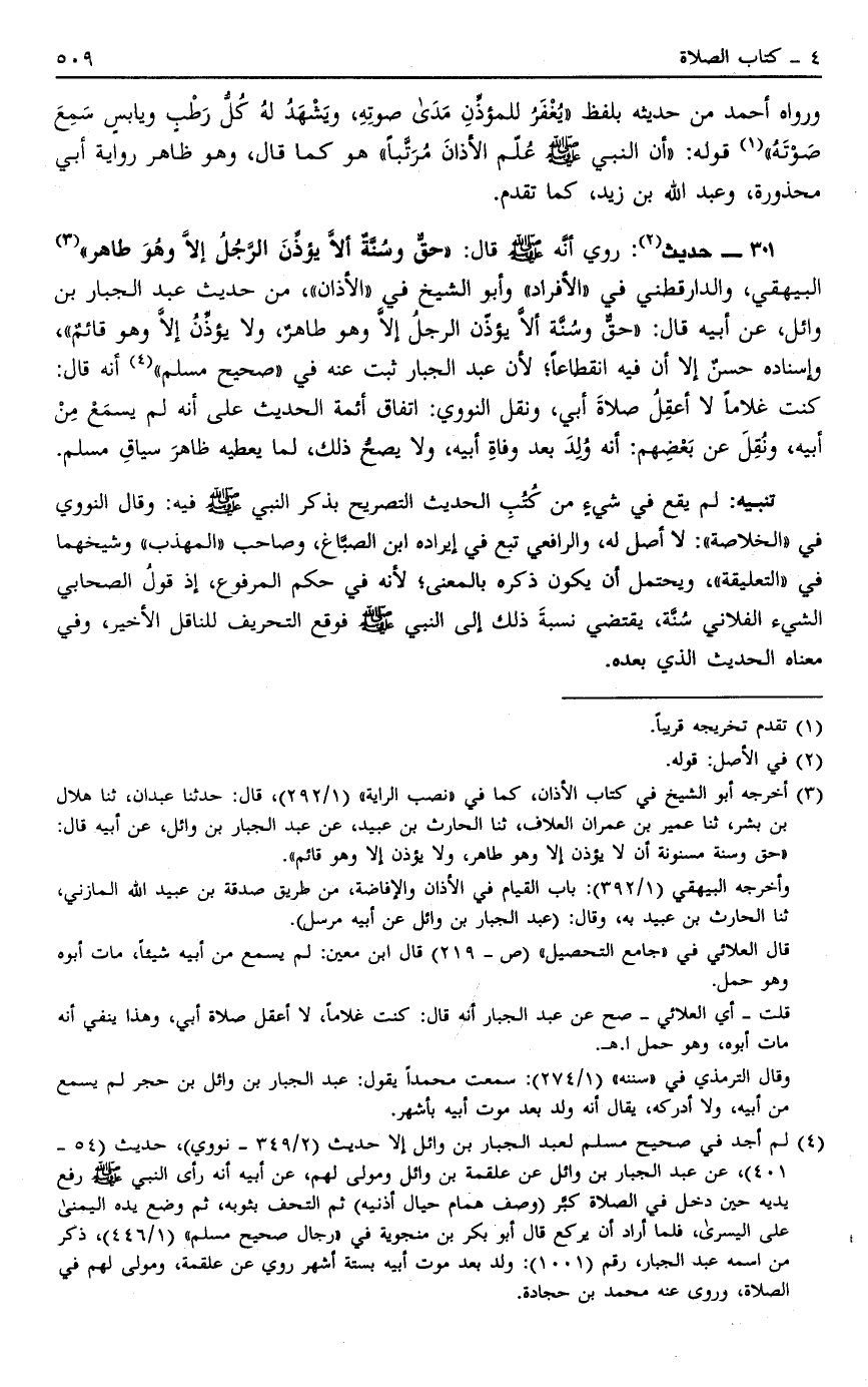 301 - حَدِيثُ:2 رُوِيَ أَنَّهُ صَلَّى اللَّهُ عَلَيْهِ وَسَلَّمَ قال: "حق وسنة أن لا يُؤَذِّنَ الرَّجُلُ إلَّا وَهُوَ طَاهِرٌ" 3 الْبَيْهَقِيّ وَالدَّارَقُطْنِيّ فِي الْأَفْرَادِ وَأَبُو الشَّيْخِ فِي الْأَذَانِ مِنْ حَدِيثِ عَبْدِ الْجَبَّارِ بْنِ وَائِلٍ عَنْ أَبِيهِ قَالَ: "حَقٌّ وَسُنَّةٌ أن لا يُؤَذِّنَ الرَّجُلُ إلَّا وَهُوَ طَاهِرٌ وَلَا يُؤَذِّنَ إلَّا وَهُوَ قَائِمٌ" وَإِسْنَادُهُ حَسَنٌ إلَّا أَنَّ فِيهِ انْقِطَاعًا لِأَنَّ عَبْدَ الْجَبَّارِ ثَبَتَ عَنْهُ فِي صَحِيحِ مُسْلِمٍ4 أَنَّهُ قَالَ: كُنْت غُلَامًا لَا أَعْقِلُ صَلَاةَ أَبِي وَنَقَلَ النَّوَوِيُّ اتِّفَاقَ أَئِمَّةِ الْحَدِيثِ عَلَى أَنَّهُ لَمْ يَسْمَعْ مِنْ أَبِيهِ وَنَقَلَ عَنْ بَعْضِهِمْ أَنَّهُ وُلِدَ بَعْدَ وَفَاةِ أَبِيهِ وَلَا يَصِحُّ ذَلِكَ لِمَا يُعْطِيهِ ظَاهِرُ سِيَاقِ مُسْلِمٍ