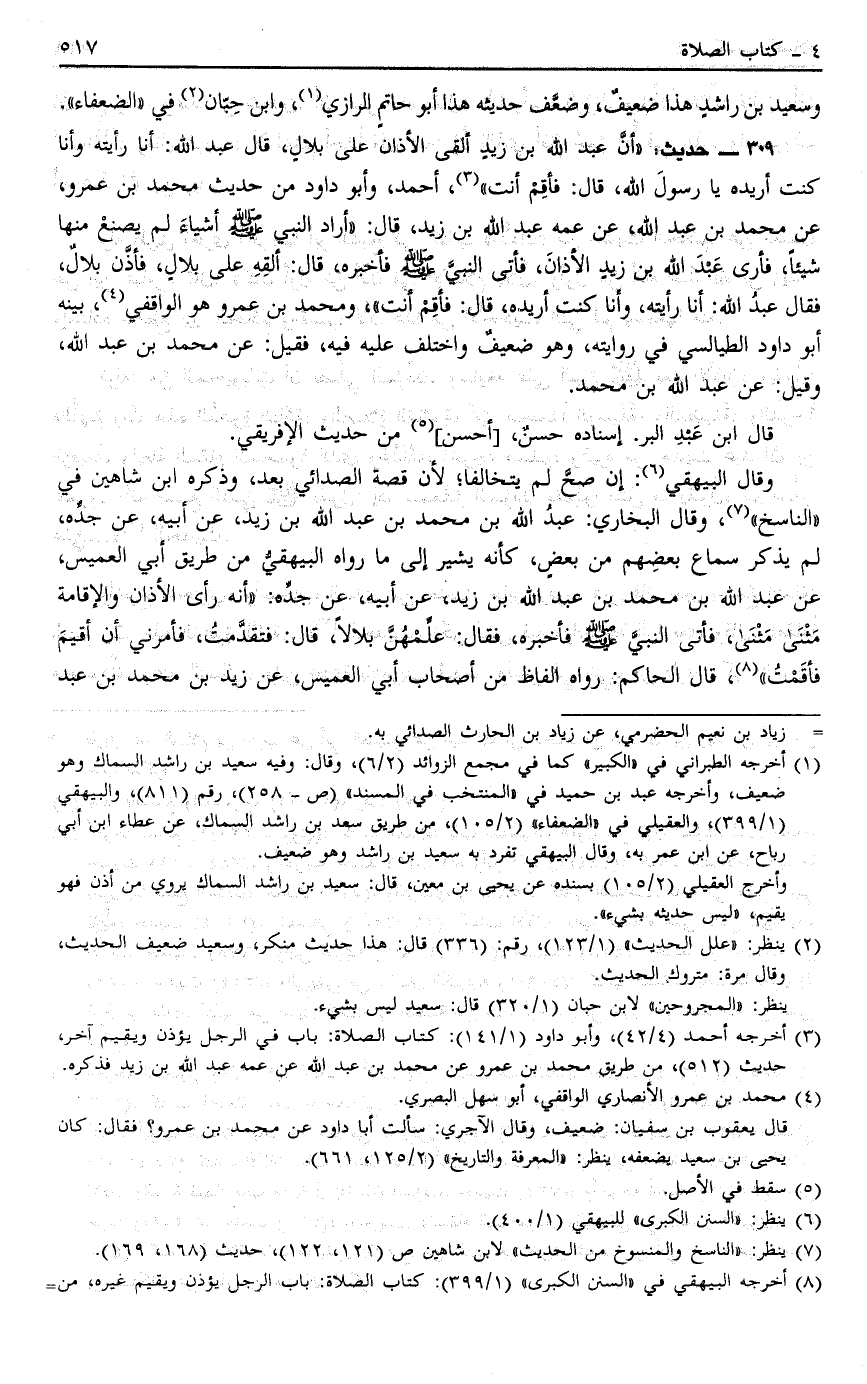 8 أخرجه البيهقي في "السنن الكبرى" "1/399": كتاب الصلاة: باب الرجل يؤذن ويقيم غيره، من طريق عبد السلام بن حرب عن أبي العميس عن عبد الله بن محمد بن عبد الله بن زيد عن أبيه عن جده فذكره.
