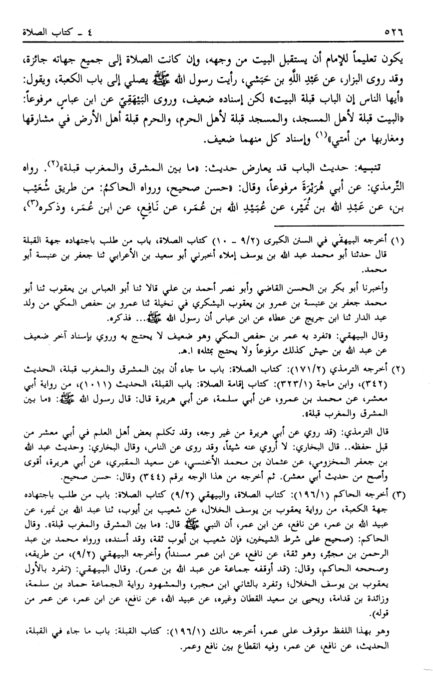 3 أخرجه الحاكم "1/196": كتاب الصلاة، والبيهقي "2/9" كتاب الصلاة: باب من طلب باجتهاده جهة الكعبة، من رواية يعقوب بن يوسف الخلال، عن شعيب بن أيوب، ثنا عبد الله بن نمير، عن عبيد الله بن عمر، عن نافع، عن ابن عمر، أن النبي صَلَّى اللَّهُ عَلَيْهِ وَسَلَّمَ قال: "ما بين المشرق والغرب قبله". وقال الحاكم: "صحيح على شرط الشيخين، فإن شعيب بن أيوب ثقة، وقد أسنده، ورواه محمد بن عبد الرحمن بن مجبر، وهو ثقة، عن نافع، عن ابن عمر مسنداً" وأخرجه البيهقي "2/9"، من طريقه، وصححه الحاكم، وقال: "قد أوقفه جماعة عن عبد الله بن عمر. وقال البيهقي: "تفرد بالأول يعقوب بن يوسف الخلال؛ وتفرد بالثاني ابن مجبر، والمشهود رواية الجماعة حماد بن سلمة، وزائدة بن قدامة، ويحيى بن سعيد القطان وغيره، عن عبيد الله، عن نافع، عن ابن عمر، عن عمر من قوله".
