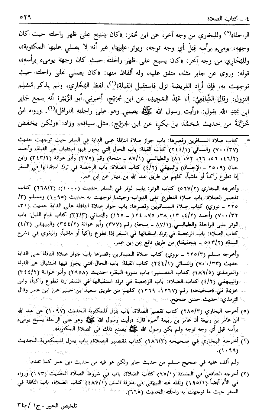 الرَّاحِلَةِ1 وَلِلْبُخَارِيِّ مِنْ وَجْهٍ آخَرَ عَنْ ابْنِ عُمَرَ: كَانَ يُسَبِّحُ عَلَى ظَهْرِ رَاحِلَتِهِ حَيْثُ كَانَ وَجْهُهُ يُومِئُ بِرَأْسِهِ قِبَلَ أَيِّ وَجْهٍ تَوَجَّهَ وَيُوتِرُ عَلَيْهَا غَيْرَ أَنَّهُ لَا يُصَلِّي عَلَيْهَا الْمَكْتُوبَةَ وَلِلْبُخَارِيِّ مِنْ وَجْهٍ آخَرَ: كَانَ يُسَبِّحُ عَلَى ظَهْرِ رَاحِلَتِهِ حَيْثُ كَانَ وَجْهُهُ يُومِئُ بِرَأْسِهِ قَوْلُهُ وَرُوِيَ عَنْ جَابِرٍ مِثْلُهُ مُتَّفَقٌ عَلَيْهِ وَلَهُ أَلْفَاظٌ مِنْهَا كَانَ يُصَلِّي عَلَى رَاحِلَتِهِ حَيْثُ تَوَجَّهَتْ بِهِ فَإِذَا أَرَادَ الْفَرِيضَةَ نَزَلَ فَاسْتَقْبَلَ الْقِبْلَةَ2 لَفْظُ الْبُخَارِيِّ وَلَمْ يَذْكُرْ مُسْلِمٌ النُّزُولَ وَقَالَ الشَّافِعِيُّ: أَنَا عَبْدُ الْمَجِيدِ عَنْ ابْنِ جُرَيْجٍ أَخْبَرَنِي أَبُو الزُّبَيْرِ أَنَّهُ سَمِعَ جَابِرَ بْنَ عَبْدِ اللَّهِ يَقُولُ: رَأَيْتُ رَسُولَ اللَّهِ صَلَّى اللَّهُ عَلَيْهِ وَسَلَّمَ يُصَلِّي وَهُوَ عَلَى رَاحِلَتِهِ النَّوَافِلَ3 وَرَوَاهُ ابْنُ خُزَيْمَةَ مِنْ حَدِيثِ مُحَمَّدِ بْنِ بَكْرٍ عَنْ ابْنِ جُرَيْجٍ مِثْلَ سِيَاقِهِ وَزَادَ وَلَكِنْ يَخْفِضُ