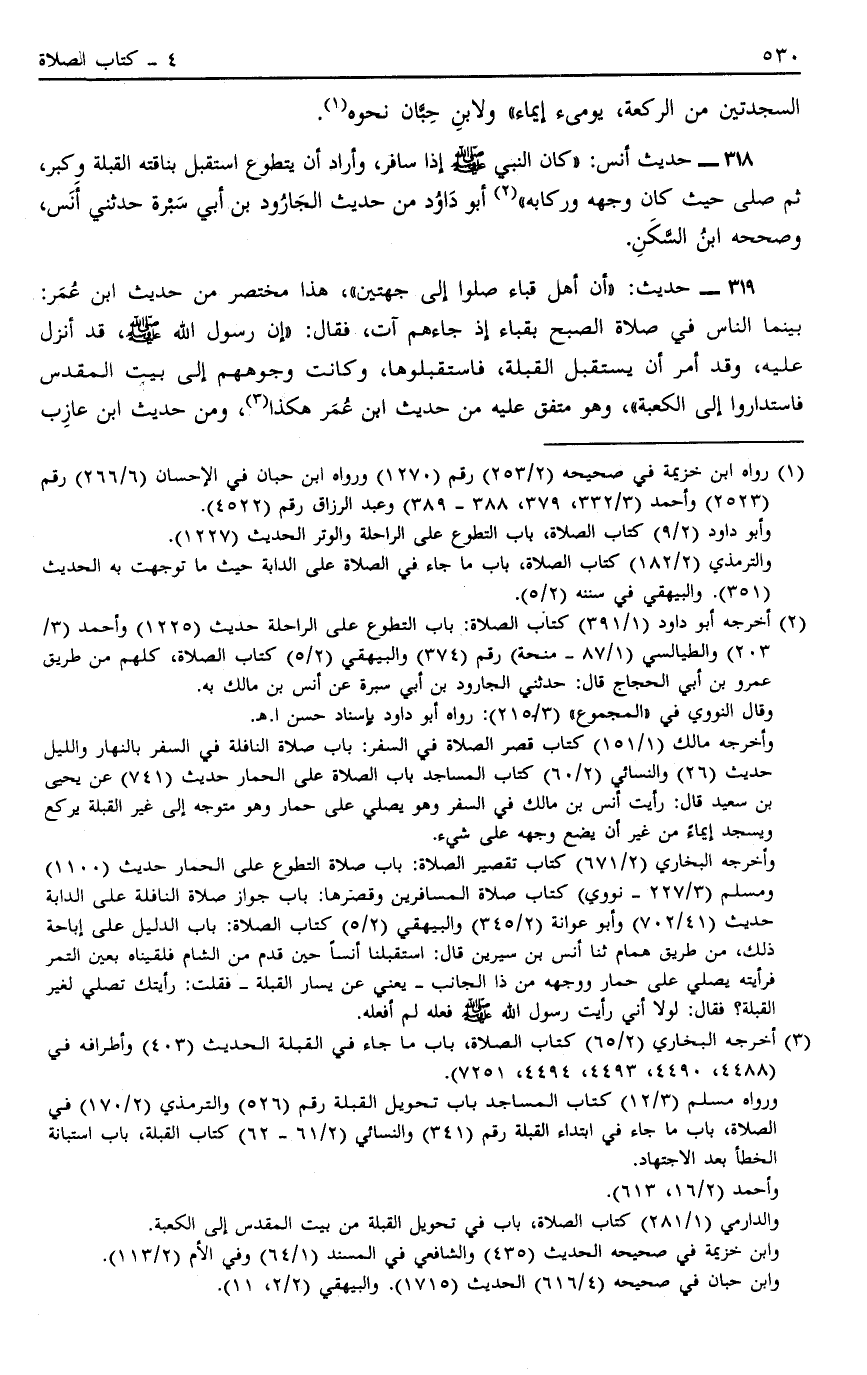 318 - حَدِيثُ أَنَسٍ: كَانَ النَّبِيَّ صَلَّى اللَّهُ عَلَيْهِ وَسَلَّمَ إذَا سَافَرَ وَأَرَادَ أَنْ يَتَطَوَّعَ اسْتَقْبَلَ بِنَاقَتِهِ الْقِبْلَةَ وَكَبَّرَ ثُمَّ صَلَّى حَيْثُ كَانَ وَجْهُهُ وَرِكَابُهُ2 أَبُو دَاوُد مِنْ حَدِيثِ الْجَارُودِ بْنِ أَبِي سَبْرَةَ حَدَّثَنِي أَنَسٌ وَصَحَّحَهُ ابْنُ السَّكَنِ